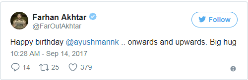 ਟੀਵੀ ਉੱਤੇ ਐਕਰਿੰਗ ਅਤੇ ਅਤੇ ਵੀਡੀਓ ਜਾਕੀ ਦੇ ਤੌਰ ਉੱਤੇ ਆਪਣਾ ਕਰੀਅਰ ਸ਼ੁਰੂ ਕਰਨ ਵਾਲੇ ਅਯੁਸ਼ਮਾਨ ਅੱਜ ਫਿਲਮਾਂ ਵਿੱਚ ਇੱਕ ਜਾਣਿਆ ਮਾਣਿਆ ਨਾਮ ਹੈ। ਆਪਣੀ ਪਹਿਲੀ ਹੀ ਫਿਲਮ 'ਵਿੱਕੀ ਡੋਨਰ' ਨਾਲ ਤਾਰੀਫਾਂ ਲੁੱਟ ਰਹੇ ਅਯੁਸ਼ਮਾਨ 'ਦਮ ਲਗਾ ਕੇ ਹਈਸ਼ਾ,ਵਿੱਕੀ ਡੋਨਰ , ਬਰੇਲੀ ਕੀ ਬਰਫੀ, ਸ਼ੁਭ ਮੰਗਲ ਸਾਵਧਾਨ ਵਰਗੀ ਕਈ ਹਿੱਟ ਫਿਲਮਾਂ ਦੇ ਚੁੱਕੇ ਹਨ। ਉਨ੍ਹਾਂ ਜਨਮਦਿਨ ਦੀ ਵਧਾਈ ਦਿੰਦੇ ਹੋਏ ਇਨੀਂ ਦਿਨੀਂ ਲਖਨਊ ਸੈਂਟਰਲ ਦੀ ਪ੍ਰਮੋਸ਼ਨ ਵਿੱਚ ਬਿਜੀ ਫਰਹਾਨ ਅਖਤਰ ਨੇ ਟਵਿਟਰ ਉੱਤੇ ਲਿਖਿਆ, ਜਨਮਦਿਨ ਮੁਬਾਰਕ ਹੋ ਅਯੁਸ਼ਮਾਨ ਖੁਰਾਨਾ . . .
