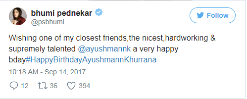 ਅਯੁਸ਼ਮਾਨ ਦੀ ਫੇਵਰਟ ਨੂੰ - ਸਟਾਰ ਭੂਮੀ ਪੇਡਨੇਕਰ ਨੇ ਇੱਕ ਤਸਵੀਰ ਸਾਂਝਾ ਕਰਦੇ ਹੋਏ ਟਵੀਟ ਕੀਤਾ, ਆਪਣੇ ਕਰੀਬੀ ਮਿੱਤਰ , ਸਭ ਤੋਂ ਚੰਗੇ , ਮਿਹਨਤੀ ਅਤੇ ਬੇਹੱਦ ਭਾਗਾਂ ਵਾਲਾ ਅਯੁਸ਼ਮਾਨ ਨੂੰ ਜਨਮਦਿਨ ਦੀ ਬਹੁਤ - ਬਹੁਤ ਸ਼ੁਭਕਾਮਨਾਵਾਂ।