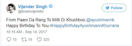 ਸਿਰਫ ਫਿਲਮੀ ਦੁਨੀਆ ਹੀ ਨਹੀਂ , ਸਗੋਂ ਬਾਕਸਿੰਗ ਸਟਾਰ ਵਿਜੇਂਦਰ ਸਿੰਘ ਨੇ ਵੀ ਉਨ੍ਹਾਂ ਨੂੰ ਵਧਾਈ ਦਿੱਤੀ ਹੈ। ਵਿਜੇਂਦਰ ਨੇ ਲਿਖਿਆ, ਪਾਣੀ ਦੇ ਰੰਗ’ ਤੋਂ ਲੈ ਕੇ ‘ਮਿੱਟੀ ਦੀ ਖੁਸ਼ਬੂ ’ ਤੱਕ। ਅਯੁਸ਼ਮਾਨ ਤੁਹਾਨੂੰ ਜਨਮਦਿਨ ਦੀਆਂ ਸ਼ੁਭਕਾਮਨਾਵਾਂ।