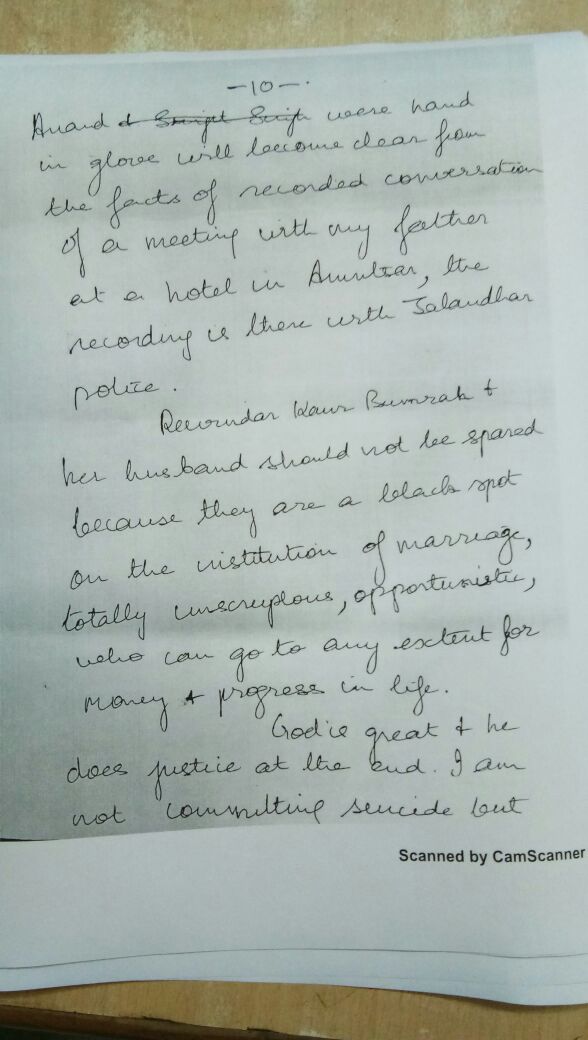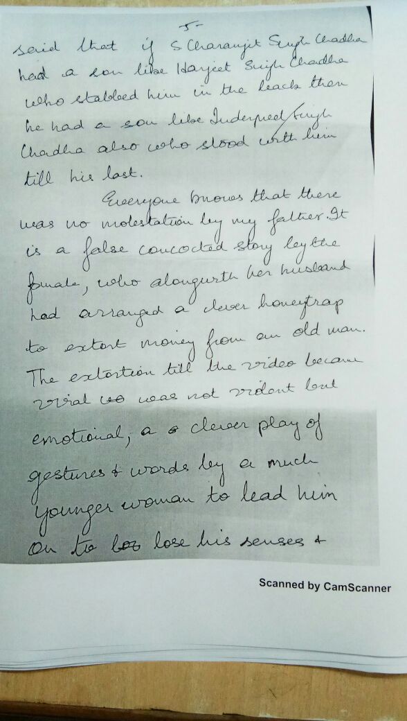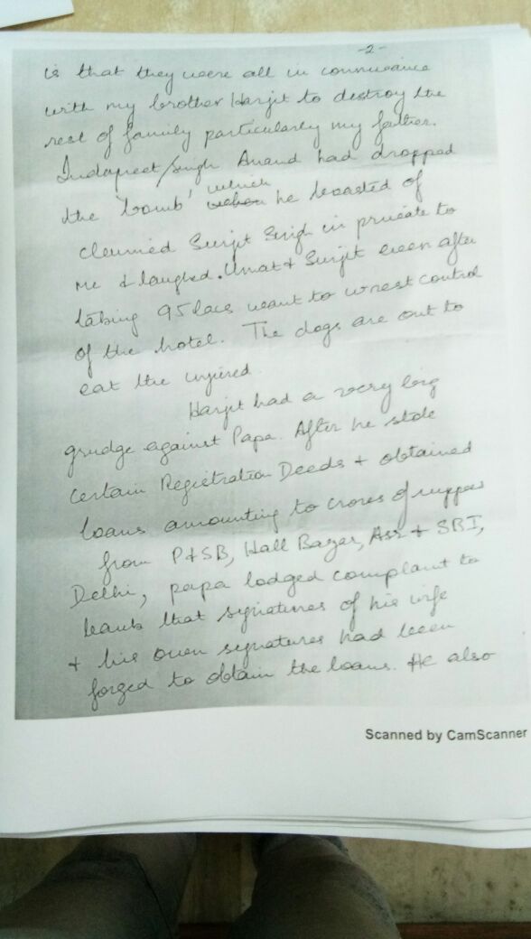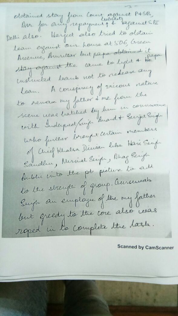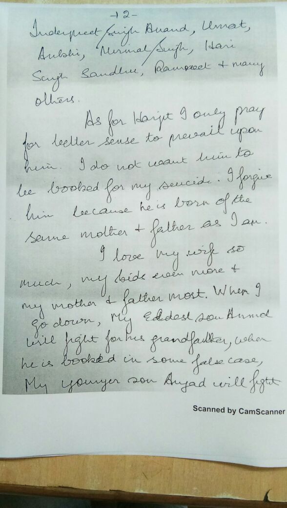 ਇਸ ਦੇ ਨਾਲ ਹੀ ਹਰਜੀਤ ਸਿੰਘ ਚੱਢਾ ਨੇ ਆਪਣੇ ਪਿਤਾ ਦੇ ਗਲਤ ਦਸਤਖਤ ਕਰਕੇ ਜਾਇਦਾਦ 'ਚ ਹੇਰਾ-ਫੇਰੀ ਕੀਤੀ ਸੀ। ਇਸ ਸੁਸਾਈਡ ਨੋਟ 'ਚ ਏ. ਡੀ.ਜੀ. ਪੀ. ਰਾਕੇਸ਼ ਚੰਦਰਾ ਸਣੇ ਸੁਰਜੀਤ, ਇੰਦਰਪ੍ਰੀਤ ਸਿੰਘ, ਹਰੀ ਸਿੰਘ ਸੰਧੂ, ਨਿਰਮਲ ਸਿੰਘ ਅਤੇ ਹੋਰਾਂ ਦੇ ਨਾਂ ਸ਼ਾਮਲ ਹਨ।