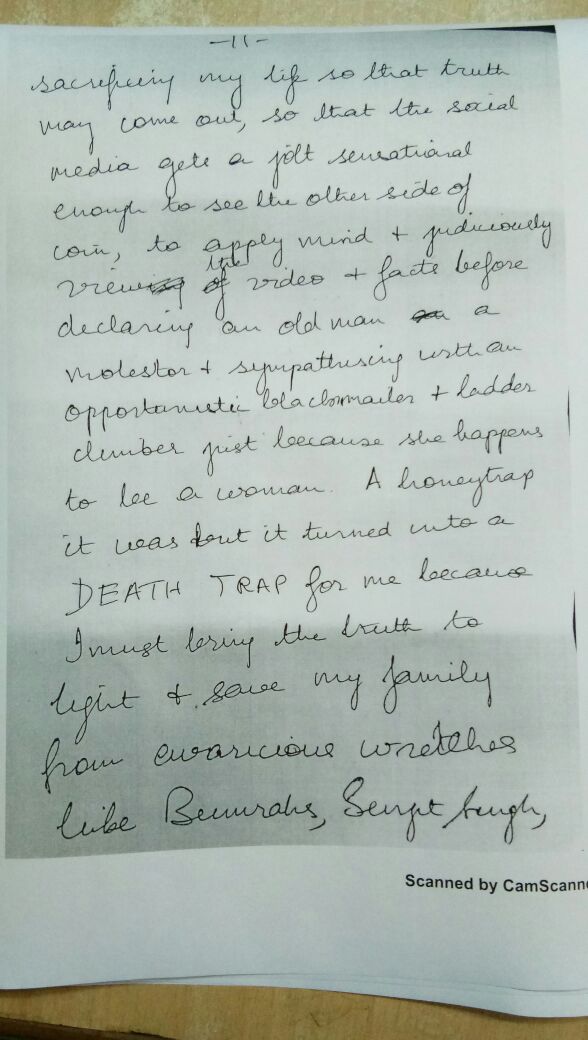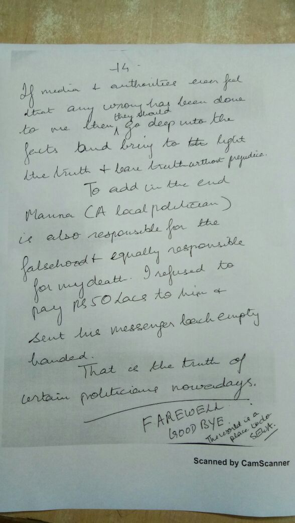ਜਿਸ ਕਾਰਨ ਉਸ ਨੇ ਅਜਿਹਾ ਕਦਮ ਚੁੱਕਿਆ। ਉਸ ਨੇ ਇਹ ਵੀ ਲਿਖਿਆ ਹੈ ਕਿ ਮੇਰੇ ਪਿਤਾ ਬੇਕਸੂਰ ਹਨ, ਹਾਂ ਉਨ੍ਹਾਂ ਤੋਂ ਇਹ ਗਲਤੀ ਜ਼ਰੂਰ ਹੋਈ ਕਿ ਉਹ ਮਹਿਲਾ ਦੀਆਂ ਗੱਲਾਂ 'ਚ ਆ ਗਏ ਪਰ ਉਸ ਦੇ ਨਾਲ ਕੋਈ ਗਲਤ ਕੰਮ ਨਹੀਂ ਕੀਤਾ।
