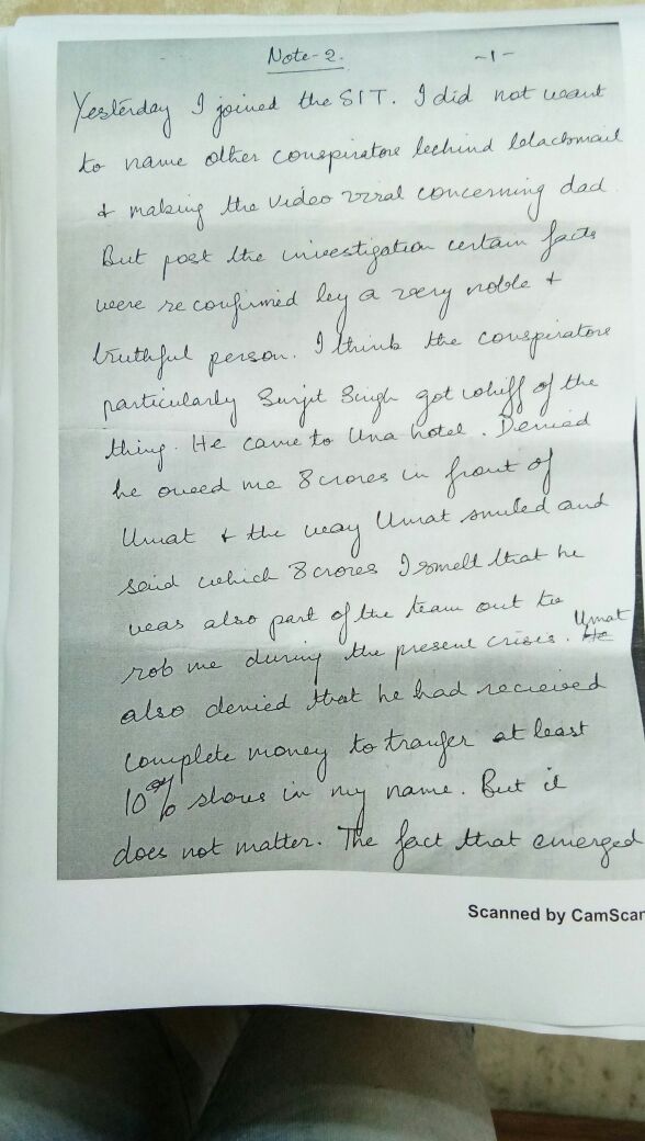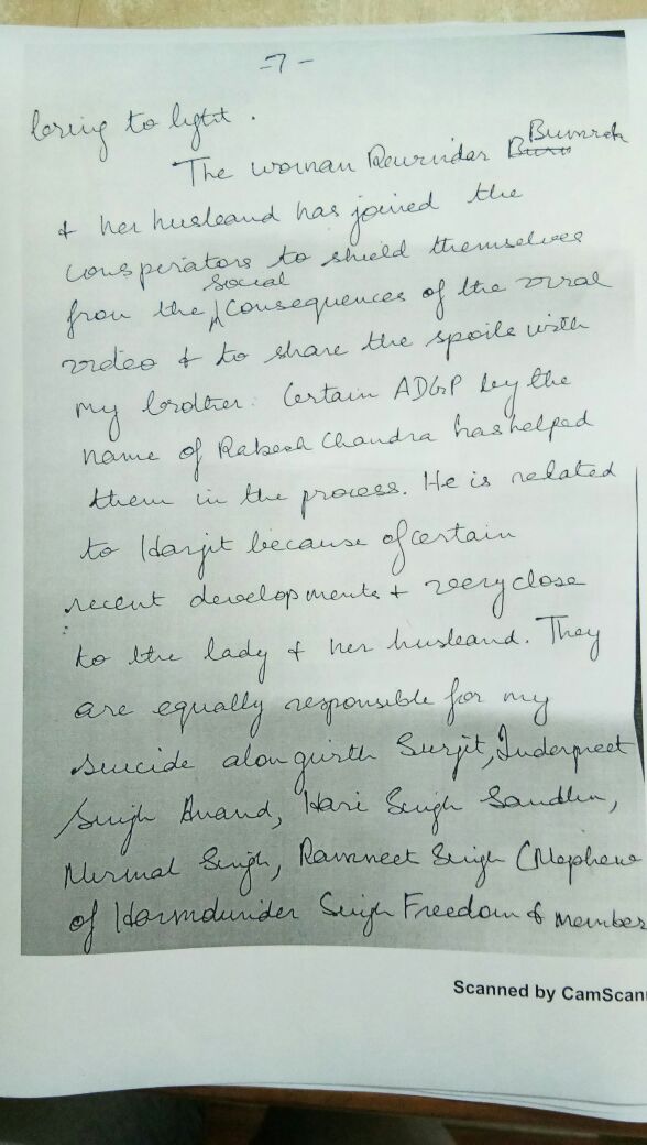 ਇਹ ਸੁਸਾਈਡ ਨੋਟ ਚੱਢਾ ਦੀ ਗੱਡੀ ਵਿਚੋਂ ਬਰਾਮਦ ਕੀਤਾ। ਇਸ ਸੁਸਾਈਡ ਨੋਟ 'ਚ ਇੰਦਰਪ੍ਰੀਤ ਨੇ ਲਿਖਿਆ ਹੈ ਕਿ ਉਸ ਨੂੰ ਅਤੇ ਉਸ ਦੇ ਪਿਤਾ ਨੂੰ ਸਾਜਿਸ਼ ਤਹਿਤ ਫਸਾਇਆ ਗਿਆ ਹੈ। ਉਸ ਦੇ ਪਿਤਾ ਨਾਲ ਵੀਡੀਓ 'ਚ ਨਜ਼ਰ ਆਈ ਔਰਤ ਅਤੇ ਉਸ ਦਾ ਪਤੀ ਇਸ ਸਾਜਿਸ਼ 'ਚ ਸ਼ਾਮਲ ਹਨ। ਸੁਸਾਈਡ ਨੋਟ 'ਚ ਇਹ ਵੀ ਲਿਖਿਆ ਹੈ ਕਿ ਛੋਟਾ ਭਰਾ ਹਰਜੀਤ ਸਿੰਘ ਨਾਲ ਉਸ ਦੀ ਅਤੇ ਉਸ ਦੇ ਪਿਤਾ ਦੀ ਨਹੀਂ ਬਣਦੀ ਸੀ ਅਤੇ ਉਸ ਨਾਲ ਜਾਇਦਾਦ ਨੂੰ ਲੈ ਕੇ ਝਗੜਾ ਚੱਲ ਰਿਹਾ ਸੀ।