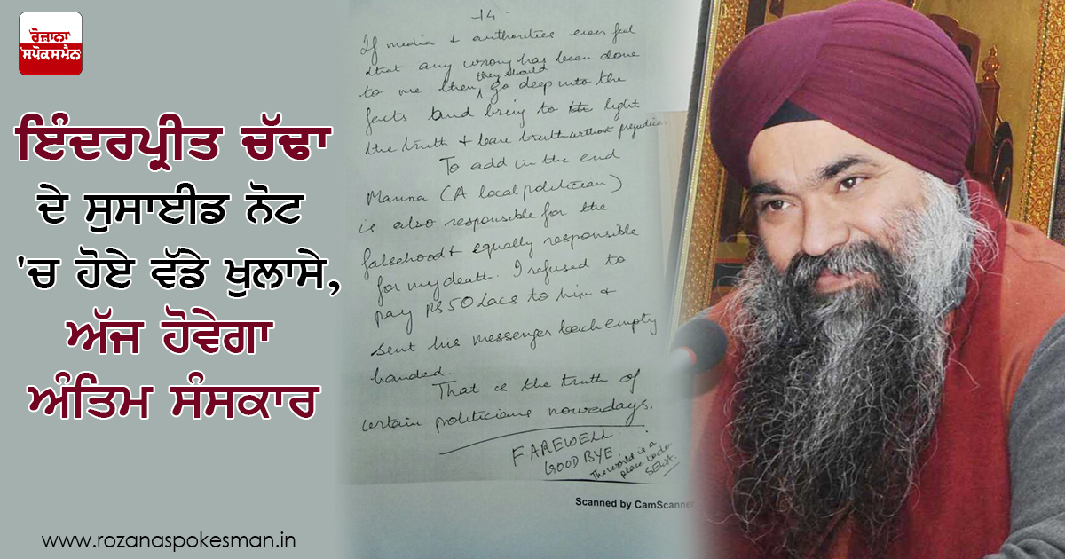 ਬੀਤੇ ਦੋ ਦਿਨ ਪਹਿਲਾਂ ਚੀਫ ਖਾਲਸਾ ਦੀਵਾਨ ਦੇ ਸਾਬਕਾ ਮੁਖੀ ਚਰਨਜੀਤ ਸਿੰਘ ਚੱਢਾ ਦੇ ਪੁੱਤਰ ਇੰਦਰਪ੍ਰੀਤ ਚੱਢਾ ਨੇ ਆਪਣੇ ਆਪਣੇ ਆਪ ਨੂੰ ਗੋਲੀ ਮਾਰ ਕੇ ਖੁਦਕੁਸ਼ੀ ਕਰ ਲਈ ਸੀ। ਜਾਣਕਾਰੀ ਮਿਲੀ ਹੈ ਕਿ ਇੰਦਰਪ੍ਰੀਤ ਚੱਢਾ ਦਾ ਅੰਤਿਮ ਸਸਕਾਰ ਅੱਜ 3 ਵਜੇ ਕੀਤਾ ਜਾਵੇਗਾ। ਇੰਦਰਪ੍ਰੀਤ ਸਿੰਘ ਚੱਢਾ ਖੁਦਕੁਸ਼ੀ ਮਾਮਲੇ 'ਚ ਪੁਲਿਸ ਨੂੰ ਇਕ ਸੁਸਾਈਡ ਨੋਟ ਬਰਾਮਦ ਹੋਇਆ ਹੈ, ਜਿਸ ਰਾਹੀ ਪੁਲਿਸ ਨੇ ਕਈ ਵੱਡੇ ਖੁਲਾਸੇ ਕੀਤੇ ਹਨ।