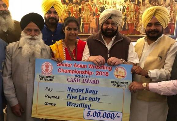 ਇਸ ਦੌਰਾਨ ਕੈਪਟਨ ਅਮਰਿੰਦਰ ਸਿੰਘ ਵੱਲੋਂ ਪਹਿਲਵਾਨ ਨਜਵੋਤ ਕੌਰ ਨੂੰ 5 ਲੱਖ ਰੁਪਏ ਦਾ ਚੈੱਕ ਵੀ ਸੌਂਪਿਆ ਗਿਆ| ਦੱਸ ਦਈਏ ਕਿ ਨਵਜੋਤ ਕੌਰ ਨੇ ਬੀਤੇ ਦਿਨੀਂ ਰੂਸ ਦੇ ਕਿਰਗਿਸਤਾਨ ਦੇ ਬਿਸ਼ਕੇਕ ‘ਚ ਖੇਡੀ ਜਾ ਰਹੀ ਏਸ਼ੀਅਨ ਕੁਸ਼ਤੀ ਚੈਂਪੀਅਨਸ਼ਿਪ ‘ਚ ਸੋਨ ਤਗ਼ਮਾ ਜਿੱਤਿਆ ਸੀ। ਨਵਜੋਤ ਨੇ ਫਾਈਨਲ ਮੁਕਾਬਲੇ ‘ਚ ਜਾਪਾਨੀ ਮਹਿਲਾ ਪਹਿਲਵਾਨ ਮੀਯੂ ਈਮਾਈ ਨੂੰ 9-1 ਨਾਲ ਮਾਤ ਦਿੱਤੀ ਤੇ ਪੁਰਾਣੀ ਹਾਰ ਦਾ ਬਦਲਾ ਵੀ ਲੈ ਲਿਆ ਸੀ। ਇਸ ਉਪਲਬਧੀ ਨਾਲ ਨਵਜੋਤ ਭਾਰਤ ਦੀ ਪਹਿਲੀ ਏਸ਼ੀਅਨ ਚੈਂਪੀਅਨ ਪਹਿਲਵਾਨ ਬਣੀ ਸੀ।