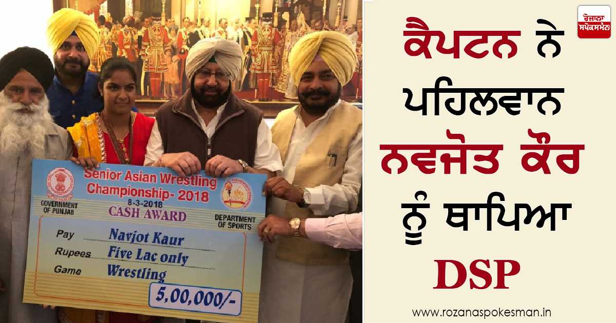 ਭਾਰਤ ਦੀ ਪਹਿਲੀ ਮਹਿਲਾ ਏਸ਼ੀਆ ਕੁਸ਼ਤੀ ਚੈਂਪੀਅਨ ਵਿਚ ਸੋਨੇ ਦਾ ਤਗਮਾ ਜਿਤ ਕੇ ਦੇਸ਼ ਦੇ ਨਾਂ ਨੂੰ ਸੁਨਹਿਰੀ ਅੱਖਰਾਂ ਵਿੱਚ ਚਮਕਾਉਣ ਵਾਲੀ ਪਹਿਲਵਾਨ ਨਵਜੋਤ ਕੌਰ ਨੂੰ ਪੰਜਾਬ ਪੁਲਿਸ ਵਿਚ ਡੀ.ਐਸ.ਪੀ ਬਣਾਇਆ ਜਾਵੇਗਾ| ਇਸ ਸਬੰਧੀ ਮੁੱਖ ਮੰਤਰੀ ਕੈਪਟਨ ਅਮਰਿੰਦਰ ਸਿੰਘ ਨੇ ਐਲਾਨ ਕਰਦਿਆਂ ਕਿਹਾ ਕਿ ਮੈਨੂੰ ਇਹ ਖੁਸ਼ੀ ਹੈ ਕਿ ਨਵਜੋਤ ਕੌਰ ਪੰਜਾਬ ਦਾ ਨਾਂਅ ਉਚਾਂ ਕੀਤਾ ਹੈ....ਪੰਜਾਬ ਸਰਕਾਰ ਨੇ ਨਵਜੋਤ ਕੌਰ ਨੂੰ ਪੰਜਾਬ ਪੁਲਿਸ 'ਚ ਡੀ.ਐਸ.ਪੀ ਦਾ ਅਹੁਦਾ ਸੰਭਾਲਣ ਦੀ ਪੇਸ਼ਕਸ਼ ਕੀਤੀ।