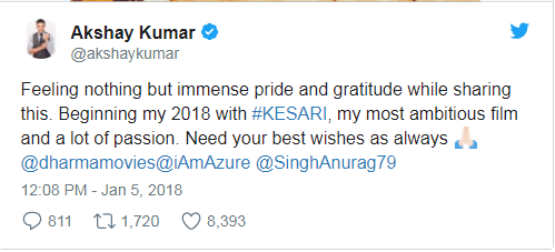 ਪੈਡਮੈਨ ਦੀ ਰਿਲੀਜ ਦੀ ਹਲਚਲ ਦੇ ਵਿੱਚ ਅਕਸ਼ੇ ਕੁਮਾਰ ਨੇ ਆਪਣੀ ਅਗਲੀ ਫਿਲਮ ਕੇਸਰੀ ਦਾ ਫਰਸਟ ਲੁਕ ਰਿਲੀਜ ਕਰ ਦਿੱਤਾ ਹੈ। ਉਨ੍ਹਾਂ ਨੇ ਟਵਿਟਰ ਉੱਤੇ ਇਸ ਤਸਵੀਰ ਨੂੰ ਸ਼ੇਅਰ ਕਰਦੇ ਹੋਏ ਦੱਸਿਆ ਕਿ ਹੁਣ ਕੇਸਰੀ ਦੀ ਸ਼ੂਟਿੰਗ ਸ਼ੁਰੂ ਹੋ ਗਈ ਹੈ ਅਤੇ ਇਸਦੇ ਲਈ ਉਨ੍ਹਾਂ ਨੂੰ ਸਾਰਿਆਂ ਦੀਆਂ ਸ਼ੁਭਕਾਮਨਾਵਾਂ ਚਾਹੀਦੀਆਂ ਹਨ।