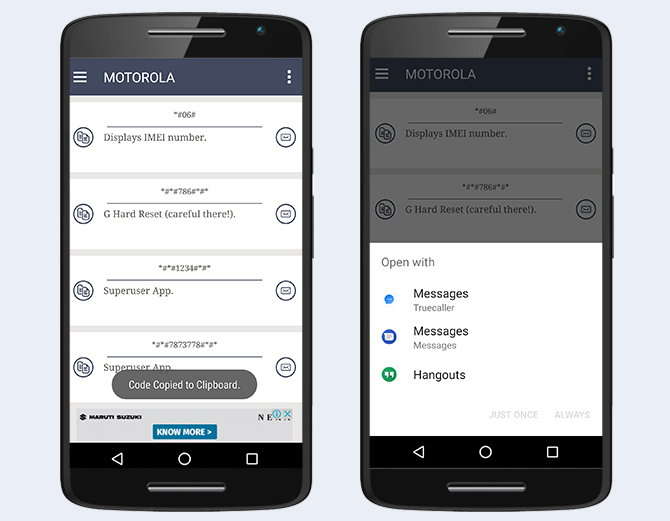 ਹਾਲਾਂਕਿ ਕਿਸ ਫੋਨ ਉੱਤੇ ਕਿਹੜਾ ਕੋਡ ਕੰਮ ਕਰੇਗਾ ਇਹ ਪਤਾ ਨਹੀਂ ਹੁੰਦਾ। ਇਸਦੇ ਲਈ ਗੂਗਲ ਪਲੇਅ ਸਟੋਰ ਉੱਤੇ ਅਜਿਹੇ ਕਈ ਐਪਸ ਹਨ ਜਿਨ੍ਹਾਂ ਉੱਤੇ ਸਾਰੇ ਫੋਨ ਦੇ ਹਿਸਾਬ ਨਾਲ ਕੋਡ ਨੂੰ ਵੱਖ - ਵੱਖ ਫਿਕਸ ਕੀਤਾ ਗਿਆ ਹੈ। ਇੰਜ ਹੀ ਇੱਕ ਐਪ ਦਾ ਨਾਮ ਹੈ Secret Android Code all mobile।