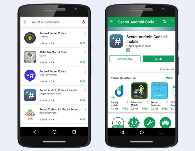 ਗੂਗਲ ਪਲੇਅ ਸਟੋਰ ਉੱਤੇ Secret Android Code ਸਰਚ ਕਰਨ ਨਾਲ ਰਿਜ਼ਲਟ ਵਿੱਚ ਢੇਰ ਸਾਰੇ ਐਪਸ ਆ ਜਾਣਗੇ। ਇਹਨਾਂ ਵਿੱਚ ਲੱਗਭੱਗ ਸਾਰੇ ਕੰਮ ਕਰਦੇ ਹਨ।