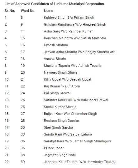 ਇਨ੍ਹਾਂ ਤੋਂ ਇਲਾਵਾ ਵਾਰਡ ਨੰ 56 ਤੋਂ ਸ਼ਾਮ ਸੁੰਦਰ ਮਲਹੋਤਰਾ, 58 ਤੋਂ ਰਾਜੇਸ਼ ਜੈਨ, 59 ਤੋਂ ਸ਼ਾਲੂ ਡਾਵਰ, 60 ਤੋਂ ਅਨਿਲ ਪਰਤੀ, 61 ਤੋਂ ਸਰੋਜ ਬੇਰੀ, 64 ਤੋਂ ਰਾਕੇਸ਼ ਪ੍ਰਾਸ਼ਰ, 65 ਤੋਂ ਪੂਨਮ ਮਲਹੋਤਰਾ, 68 ਤੋਂ ਬਲਜਿੰਦਰ ਸਿੰਘ ਬੰਟੀ, 69 ਤੋਂ ਕੁਲਵਿੰਦਰ ਕੌਰ, 72 ਤੋਂ ਹਰੀ ਸਿੰਘ ਬਰਾੜ, 73 ਤੋਂ ਸੀਮਾ ਕਪੂਰ, 74 ਤੋਂ ਪੰਕਜ ਕਾਕਾ, 75 ਤੋਂ ਅਮ੍ਰਿਤ ਵਰਸ਼ਾ ਰਾਮਪਾਲ, 76 ਤੋਂ ਗੁਰਪ੍ਰੀਤ ਬੱਸੀ, 77 ਤੋਂ ਸਨੇਹ ਬਲਕਾਰ, 79 ਤੋਂ ਕਮਲੇਸ਼ ਸ਼ਰਮਾ, 83 ਤੋਂ ਇੰਦੂ ਥਾਪਰ, 86 ਤੋਂ ਅਸ਼ਵਨੀ ਸ਼ਰਮਾ, 87 ਤੋਂ ਕੁਲਵੰਤ ਕੌਰ, 90 ਤੋਂ ਡਾ. ਜੈ ਪ੍ਰਕਾਸ਼, 91 ਤੋਂ ਗੁਰਪਿੰਦਰ ਕੌਰ ਸੰਧੂ, ਵਾਰਡ ਨੰ.92 ਤੋਂ ਹਰਵਿੰਦਰ ਰੌਕੀ ਭਾਟੀਆ ਤੇ ਵਾਰਡ ਨੰ. 93 ਤੋਂ ਲਵਲੀਨ ਕੌਰ ਤੂਰ ਕਾਂਗਰਸ ਦੇ ਉਮੀਦਵਾਰ ਹੋਣਗੇ।