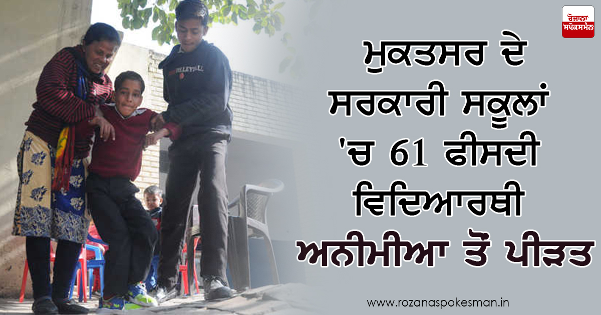 ਮੁਕਤਸਰ : ਸਿਹਤ ਸਬੰਧੀ ਕਰਵਾਏ ਸਰਵੇਖਣ "ਕੋਸ਼ਿਸ਼-ਸੀ.ਬੀ.ਸੀ. ਮੁਹਿੰਮ" ਜੋ ਕਿ ਹਾਲ ਹੀ ਵਿਚ ਜ਼ਿਲ੍ਹਾ ਪ੍ਰਸ਼ਾਸਨ ਵੱਲੋਂ ਕਰਵਾਇਆ ਗਿਆ ਸੀ, ਦੇ ਅਨੁਸਾਰ ਮੁਕਤਸਰ ਜ਼ਿਲ੍ਹੇ ਵਿਚ ਸਰਕਾਰੀ ਸਕੂਲਾਂ ਵਿਚ 61 ਫ਼ੀਸਦੀ ਵਿਦਿਆਰਥੀਆਂ ਵਿਚ ਖੂਨ ਦੀ ਕਮੀ ਹੈ। ਕੁੱਲ ਮਿਲਾ ਕੇ 79,048 ਵਿਦਿਆਰਥੀਆਂ ਵਿੱਚੋਂ 48,827 ਐਨੀਮਿਕ ਹਨ, ਜੋ ਕਿ ਜ਼ਿਲ੍ਹਾ ਪ੍ਰਸ਼ਾਸਨ ਲਈ ਚਿੰਤਾ ਦਾ ਕਾਰਨ ਬਣਿਆ ਹੋਇਆ ਹੈ।