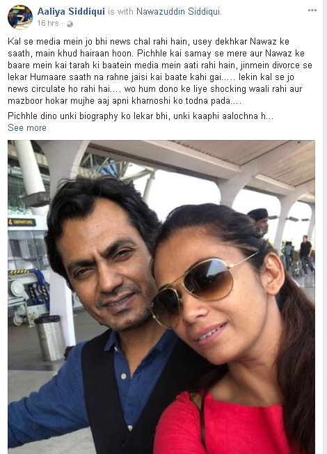 ਉਧਰ ਇਸ ਮਾਮਲੇ ਦੇ ਸਾਹਮਣੇ ਆਉਣ ਤੋਂ ਬਾਅਦ ਜਿਥੇ ਨਵਾਜ਼ ਨੇ ਇਹ ਟਵੀਟ ਕੀਤਾ ਹੈ, ਉਥੇ ਹੀ ਨਵਾਜ਼ ਦੀ ਪਤਨੀ ਆਲੀਆ ਨੇ ਵੀ ਇਸ ਮਾਮਲੇ 'ਤੇ ਹੈਰਾਨੀ ਪ੍ਰਗਟਾਈ ਹੈ ਅਤੇ ਸੋਸ਼ਲ ਮੀਡੀਆ 'ਤੇ ਇਕ ਤਸਵੀਰ ਸਾਂਝੀ ਕਰ ਕੇ ਲਿਖਿਆ ਹੈ ਕਿ ਕੁੱਝ ਦਿਨਾਂ ਤੋਂ ਮੇਰੇ ਅਤੇ ਨਵਾਜ਼ੂਦੀਨ ਬਾਰੇ ਮੀਡੀਆ 'ਚ ਜੋ ਖ਼ਬਰਾਂ ਆ ਰਹੀਆਂ ਹਨ ਉਹ ਸਾਡੇ ਦੋਹਾਂ ਨੂੰ ਹੈਰਾਨ ਕਰ ਰਹੀਆਂ ਹਨ। ਕਦੇ ਕੋਈ ਕਹਿੰਦਾ ਹੈ ਕਿ ਸਾਡਾ ਰਿਸ਼ਤਾ ਸਹੀ ਨਹੀਂ ਚਲ ਰਿਹਾ ਅਤੇ ਕਦੇ ਕੋਈ ਸਾਡਾ ਤਲਾਕ ਕਰਵਾ ਰਿਹਾ ਹੈ।