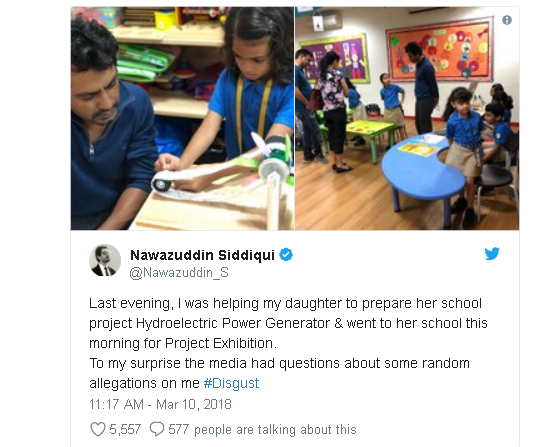 ਨਵਾਜ਼ੂਦੀਨ ਅਪਣੇ ਟਵੀਟ ਵਿਚ ਲਿਖਦੇ ਹਨ ਕਿ ਬੀਤੀ ਸ਼ਾਮ ਬੇਟੀ ਦੇ ਹਾਈਡ੍ਰੋਕਲੇਕਿਟ੍ਰਕ ਪਾਵਰ ਜਨਰੇਟਰ ਨਾਲ ਜੁੜੇ ਸਕੂਲੀ ਪ੍ਰੋਜੈਕਟ ਦੀ ਤਿਆਰੀ ਕਰਵਾਉਣ ਤੋਂ ਬਾਅਦ ਜਦੋਂ ਮੈਂ ਦੂਜੇ ਦਿਨ ਆਪਣੀ ਬੇਟੀ ਦੇ ਸਕੂਲ ਜਾਂਦਾ ਹਾਂ ਤੇ ਅਚਾਨਕ ਮੀਡੀਆ ਮੈਨੂੰ ਕੁੱਝ ਦੋਸ਼ਾਂ ਸਬੰਧੀ ਮੇਰੇ ਤੋਂ ਸਵਾਲ ਪੁਛਦਾ ਹੈ ਤਾਂ ਮੈਂ ਇਸ ਤੋਂ ਬਹੁਤ ਹੈਰਾਨ ਹੁੰਦਾ ਹਾਂ।