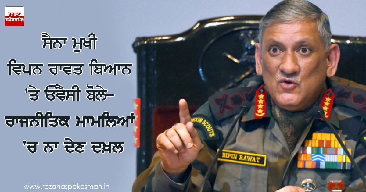 ਫੌਜ ਦੇ ਮੁਖੀ ਵਿਪਨ ਰਾਵਤ ਨੇ ਬੰਗਲਾਦੇਸ਼ੀ ਨਾਗਰਿਕਾਂ ਦੀ ਘੁਸਪੈਠ ਤੇ ਅਸਾਮ ਦੀ ਆਲ ਇੰਡਿਆ ਯੂਨਾਈਟਿਡ ਡੈਮੋਕ੍ਰਰੇਟਿਕ ਫਰੰਟ AIUDF) ‘ਤੇ ਦਿੱਤੇ ਗਏ ਬਿਆਨ ਨੇ ਰਾਜਨੀਤਿਕ ਰੂਪ ਧਾਰ ਲਿਆ ਹੈ। AIMIM ਨੇਤਾ ਓਵੈਸੀ ਨੇ ਵੀ ਆਰਮੀ ਚੀਫ ਦੇ ਬਿਆਨ ‘ਤੇ ਸਵਾਲ ਚੁੱਕੇ ਹਨ। ਓਵੈਸੀ ਨੇ ਟਵੀਟ ਕੀਤਾ ਹੈ ਕਿ ਆਮਰੀ ਚੀਫ ਨੂੰ ਰਾਜਨੀਤੀ ਮਾਮਲੇ ‘ਚ ਦਖਲ ਨਹੀਂ ਦੇਣਾ ਚਾਹੀਦਾ, ਕਿਸੇ ਵੀ ਰਾਜਨੀਤਿਕ ਪਾਰਟੀ ਦੇ ਮਾਮਲੇ ‘ਚ ਬਿਆਨ ਦੇਣਾ ਉਨ੍ਹਾਂ ਦਾ ਕੰਮ ਨਹੀਂ ਹੈ। ਲੋਕਤੰਤਰ ਤੇ ਸੰਵਿਧਾਨ ਇਸਦੀ ਇਜਾਜਤ ਨਹੀਂ ਦਿੰਦਾ।
