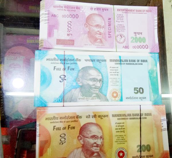 ਜੋ ਕਿ ਮਨੋਰੰਜਨ ਬੈਂਕ ਆਫ ਇੰਡੀਆ ਵੱਲੋਂ ਛਾਪੇ ਗਏ ਹਨ। ਜਿਨ੍ਹਾਂ 'ਤੇ 'ਫੁੱਲ ਆਫ ਫਨ' ਅਤੇ 'ਬੱਚੋਂ ਕਾ ਖੇਲ' ਲਿਖਿਆ ਹੋਇਆ ਹੈ। ਜੇਕਰ ਇਨ੍ਹਾਂ ਨੋਟਾਂ ਨੂੰ ਧਿਆਨ ਨਾਲ ਦੇਖਿਆ ਜਾਵੇ ਤਾਂ ਹੀ ਇਨ੍ਹਾਂ ਉਪਰ ਲਿਖੇ ਸ਼ਬਦ ਅਤੇ ਬੈਂਕ ਦਾ ਨਾਮ ਪੜ੍ਹ ਕੇ ਪਤਾ ਲੱਗਦਾ ਹੈ ਕਿ ਇਹ ਨਕਲੀ ਨੋਟ ਹਨ, ਨਹੀਂ ਤਾਂ ਦੂਰੋਂ ਪਏ ਇਹ ਨਕਲੀ ਨੋਟ ਬਿਲਕੁੱਲ ਅਸਲੀ ਨੋਟਾਂ ਦਾ ਭੁਲੇਖਾ ਪਾਉਂਦੇ ਹਨ।