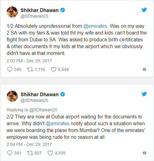 ਸ਼ਿਖਰ ਧਵਨ ਨੇ ਟਵੀਟ ਕਰ ਕੇ ਐਮੀਰੇਟਸ ਏਅਰਲਾਇੰਸ ਨੂੰ ਗੈਰ-ਪੇਸ਼ੇਵਰ ਕਰਾਰ ਦਿੱਤਾ ਅਤੇ ਉਨ੍ਹਾਂ ਦੇ ਬਾਰੇ ਵਿਚ ਲਿਖਿਆ, ''ਐਮੀਰੇਟਸ ਏਅਰਲਾਇੰਸ ਬਿਲਕੁਲ ਗੈਰ-ਪੇਸ਼ੇਵਰ ਹੈ। ਮੈਂ ਆਪਣੇ ਬੱਚਿਆਂ ਨਾਲ ਅਫਰੀਕਾ ਜਾ ਰਿਹਾ ਸੀ ਪਰ ਦੁਬਈ ਵਿਚ ਉਨ੍ਹਾਂ ਨੂੰ ਰੋਕ ਦਿੱਤਾ ਗਿਆ। ਉਨ੍ਹਾਂ ਤੋਂ ਬਰਥ ਸਰਟੀਫਿਕੇਟ ਅਤੇ ਦੂਜੇ ਕਾਗਜਾਤ ਮੰਗੇ ਗਏ ਜੋ ਮੇਰੇ ਬੱਚਿਆਂ ਕੋਲ ਨਹੀਂ ਸਨ।
