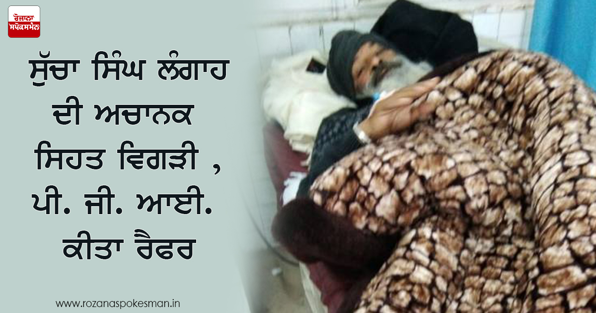 ਪਟਿਆਲਾ: ਬਲਾਤਕਾਰ ਦੇ ਇਲਜ਼ਾਮਾਂ ਦਾ ਸਾਹਮਣਾ ਕਰ ਰਹੇ ਸਾਬਕਾ ਕੈਬਨਿਟ ਮੰਤਰੀ ਤੇ ਅਕਾਲੀ ਲੀਡਰ ਸੁੱਚਾ ਸਿੰਘ ਲੰਗਾਹ ਨੂੰ ਪੀ.ਜੀ.ਆਈ. ਚੰਡੀਗੜ੍ਹ ਭੇਜਿਆ ਗਿਆ ਹੈ। ਬੀਤੀ ਦੇਰ ਰਾਤ ਸਾਬਕਾ ਸ਼੍ਰੋਮਣੀ ਕਮੇਟੀ ਮੈਂਬਰ ਸੁੱਚਾ ਸਿੰਘ ਲੰਗਾਹ ਨੇ ਸਿਰ ਦਰਦ ਦੀ ਸ਼ਿਕਾਇਤ ਕੀਤੀ ਸੀ।