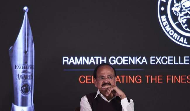 ਨਵੀਂ ਦਿੱਲੀ: ਪੱਤਰਕਾਰੀ ਦੇ ਖੇਤਰ ਵਿੱਚ ਦਿੱਤਾ ਜਾਣ ਵਾਲਾ ਨਾਮੀ ਰਾਮਨਾਥ ਗੋਇੰਕਾ ਪੁਰਸਕਾਰ ਉਪ-ਰਾਸ਼ਟਰਪਤੀ ਵੈਂਕਈਆ ਨਾਇਡੂ ਨੇ ਦੇਸ਼ ਦੇ 26 ਪੱਤਰਕਾਰਾਂ ਨੂੰ ਪ੍ਰਦਾਨ ਕੀਤਾ। ਇਸ ਸਾਲ ਪੁਰਸਕਾਰ ਦੇ 12ਵੇਂ ਸਮਾਗਮ ਵਿੱਚ ਪ੍ਰਿੰਟ ਅਤੇ ਬ੍ਰੌਡਕਾਸਟ ਸਮੇਤ 25 ਵਰਗਾਂ ਵਿੱਚ ਸਾਲ 2016 ‘ਚ ਅਹਿਮ ਯੋਗਦਾਨ ਦੇਣ ਦੇ ਲਈ 26 ਪੱਤਰਕਾਰਾਂ ਨੂੰ ਇਹ ਪੁਰਸਕਾਰ ਦਿੱਤਾ ਗਿਆ।