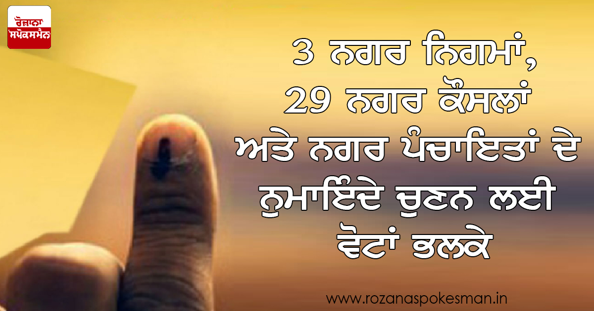 ਚੰਡੀਗੜ੍ਹ, 15 ਦਸੰਬਰ: ਪੰਜਾਬ ਦੀਆਂ 3 ਨਗਰ ਨਿਗਮਾਂ ਅਤੇ 29 ਨਗਰ ਕੌਸਲਾਂ /ਨਗਰ ਪੰਚਾਇਤਾਂ ਦੇ ਨੁਮਾਇੰਦੇ ਚੁਨਣ ਲਈ ਵੋਟਾਂ ਪਾਉਣ ਦਾ ਅਮਲ ਮਿਤੀ 17 ਦਸੰਬਰ, 2017 ਦਿਨ ਐਤਵਾਰ ਨੂੰ ਸਵੇਰੇ 8:00 ਵਜੇ ਤੋਂ ਸਾਮ 4:00 ਵਜੇ ਤੱਕ ਹੋਵੇਗਾ।