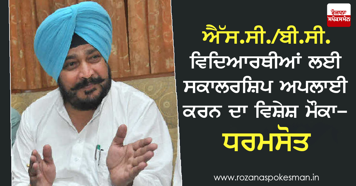 ਚੰਡੀਗੜ੍ਹ - ਪੰਜਾਬ ਦੇ ਅਨੁਸੂਚਿਤ ਜਾਤੀਆਂ, ਪੱਛੜੀਆਂ ਸ਼੍ਰੇਣੀਆਂ ਅਤੇ ਘੱਟ ਗਿਣਤੀ ਵਰਗ ਭਲਾਈ ਮੰਤਰੀ ਸਾਧੂ ਸਿੰਘ ਧਰਮਸੋਤ ਨੇ ਕਿਹਾ ਹੈ ਕਿ ਸੂਬਾ ਸਰਕਾਰ ਨੇ ਪੋਸਟ ਮੈਟ੍ਰਿਕ ਸਕਾਲਰਸ਼ਿਪ ਸਕੀਮਾਂ ਲਈ ਆਨਲਾਈਨ ਅਪਲਾਈ ਕਰਨ 'ਚ ਅਸਫ਼ਲ ਰਹਿਣ ਵਾਲੇ ਅਨੁਸੂਚਿਤ ਜਾਤੀ ਤੇ ਪੱਛੜੀਆਂ ਸ਼੍ਰੇਣੀਆਂ ਵਰਗ ਨਾਲ ਸਬੰਧਿਤ ਵਿਦਿਆਰਥੀਆਂ ਨੂੰ ਆਫ਼ਲਾਈਨ ਭਾਵ ਨਿੱਜੀ ਤੌਰ 'ਤੇ ਦਸਤੀ ਦਸਤਾਵੇਜ਼ ਜਮ੍ਹਾ ਕਰਵਾਉਣ ਦਾ ਵਿਸ਼ੇਸ਼ ਮੌਕਾ ਦੇਣ ਦਾ ਫੈਸਲਾ ਕੀਤਾ ਹੈ।