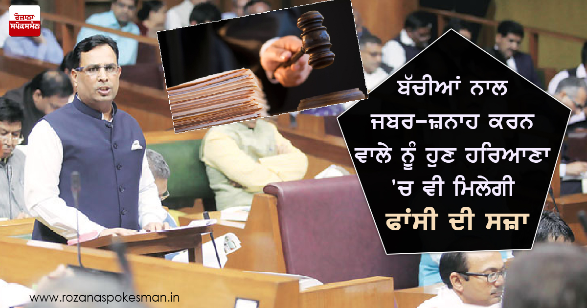 ਹਰਿਆਣਾ ਸਰਕਾਰ ਨੇ 12 ਸਾਲ ਜਾਂ ਉਸ ਤੋਂ ਘੱਟ ਉਮਰ ਦੀਆਂ ਲੜਕੀਆਂ ਦੇ ਜਬਰ-ਜ਼ਨਾਹ ਦੇ ਦੋਸ਼ੀਆਂ ਨੂੰ ਮੌਤ ਦੀ ਸਜ਼ਾ ਦੇਣ ਦੀ ਵਿਵਸਥਾ ਨਾਲ ਸਬੰਧਤ ਕਾਨੂੰਨ ਲਿਆਉਣ ਦੇ ਪ੍ਰਸਤਾਵ ਨੂੰ ਮਨਜ਼ੂਰੀ ਦੇ ਦਿੱਤੀ ਜੋ ਕਿ ਸਰਵਸੰਮਤੀ ਨਾਲ ਦੇ ਨਾਲ ਹੋਇਆ। ਮੁੱਖ ਮੰਤਰੀ ਮਨੋਹਰ ਲਾਲ ਖੱਟੜ ਦੀ ਅਗਵਾਈ ਵਿਚ ਹੋਈ ਸੂਬਾਈ ਮੰਤਰੀ ਮੰਡਲ ਦੀ ਮੀਟਿੰਗ ਵਿਚ ਯੌਨ ਅਪਰਾਧਾਂ ਨਾਲ ਜੁੜੇ ਮੌਜੂਦਾ ਅਪਰਾਧਿਕ ਕਾਨੂੰਨਾਂ ਨੂੰ ਹੋਰ ਸਖਤ ਕਰਨ ਦਾ ਵੀ ਫ਼ੈਸਲਾ ਕੀਤਾ ਗਿਆ। ਹੁਣ ਸੂਬੇ ‘ਚ 12 ਸਾਲ ਤਕ ਦੀ ਬੱਚੀ ਦੇ ਬਲਾਤਕਾਰੀ ਨੂੰ ਘੱਟੋ-ਘੱਟੋ 14 ਸਾਲ ਦੀ ਸਖਤ ਸਜ਼ਾ ਜਾਂ ਫਾਂਸੀ ਦੀ ਸਜ਼ਾ ਹੋਵੇਗੀ।