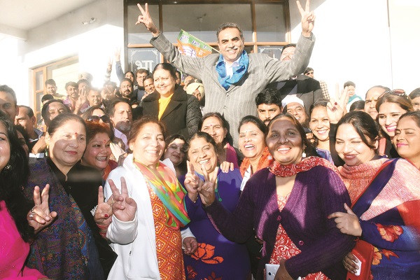 ਚੰਡੀਗੜ੍ਹ, 18 ਦਸੰਬਰ 2017 (ਸਰਬਜੀਤ ਢਿੱਲੋਂ) : ਭਾਰਤੀ ਜਨਤਾ ਪਾਰਟੀ ਦੀ ਗੁਜਰਾਤ ਅਤੇ ਹਿਮਾਚਲ ਪ੍ਰਦੇਸ਼ 'ਚ ਜਿੱਤ ਮਗਰੋਂ ਚੰਡੀਗੜ੍ਹ ਇਕਾਈ ਦੇ ਆਗੂਆਂ 'ਚ ਖ਼ੁਸ਼ੀ ਦੀ ਲਹਿਰ ਦੌੜ ਗਈ। ਸੈਕਟਰ 33 ਦੇ ਭਾਜਪਾ ਦੇ ਸਟੇਟ ਦਫ਼ਤਰ 'ਚ ਪਾਰਟੀ ਪ੍ਰਧਾਨ ਸੰਜੇ ਟੰਡਨ ਦੀ ਅਗਵਾਈ 'ਚ ਮੇਅਰ ਆਸ਼ਾ ਜੈਸਵਾਲ, ਪਾਰਟੀ ਦੇ ਚੁਣੇ ਹੋਏ ਕੌਂਸਲਰਾਂ ਅਤੇ ਸੀਨੀਅਰ ਆਗੂਆਂ ਨੇ ਪਾਰਟੀ ਵਰਕਰਾਂ ਨਾਲ ਜਿੱਤ ਦੀ ਖ਼ੁਸ਼ੀ 'ਚ ਲੱਡੂ ਵੰਡੇ ਅਤੇ ਭੰਗੜੇ ਪਾਏ ਗਏ।