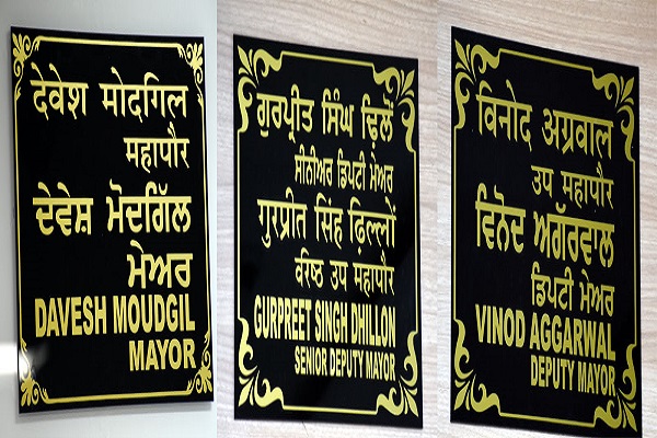 ਚੰਡੀਗੜ੍ਹ, 20 ਫ਼ਰਵਰੀ (ਸਰਬਜੀਤ ਢਿੱਲੋਂ) : ਮਿਊਂਸਪਲ ਕਾਰਪੋਰੇਸ਼ਨ ਚੰਡੀਗੜ੍ਹ ਦੇ ਮੇਅਰ ਦਿਵੇਸ਼ ਮੋਦਗਿਲ, ਸੀਨੀਅਰ ਡਿਪਟੀ ਮੇਅਰ ਗੁਰਪ੍ਰੀਤ ਸਿੰਘ ਢਿੱਲੋਂ ਅਤੇ ਡਿਪਟੀ ਮੇਅਰ ਵਿਨੋਦ ਅਗਰਵਾਲ ਵਲੋਂ ਪੰਜਾਬੀਆਂ ਦੀ ਰਾਜਧਾਨੀ ਵਿਚ ਮਾਂ-ਬੋਲੀ ਪੰਜਾਬੀ ਨੂੰ ਬਣਦਾ ਸਤਿਕਾਰ ਦੇਣ ਲਈ ਅਪਣੇ ਦਫ਼ਤਰਾਂ ਅੱਗੇ ਲੱਗੀਆਂ ਨਾਵਾਂ ਦੀਆਂ ਤਖ਼ਤੀਆਂ 'ਤੇ ਅੰਗਰੇਜ਼ੀ ਤੇ ਹਿੰਦੀ ਦੇ ਨਾਲ-ਨਾਲ ਪੰਜਾਬ ਭਾਸ਼ਾ ਨੂੰ ਵੀ ਸਤਿਕਾਰ ਦੇਣਾ ਸ਼ੁਰੂ ਕਰ ਦਿਤਾ ਹੈ। ਜਦਕਿ ਇਸ ਤੋਂ ਪਹਿਲਾਂ ਬਣਦੇ ਰਹੇ ਮੇਅਰਾਂ ਨੇ ਪੰਜਾਬੀ ਭਾਸ਼ਾ ਨੂੰ ਨੁੱਕਰੇ ਲਾਈ ਰਖਿਆ।