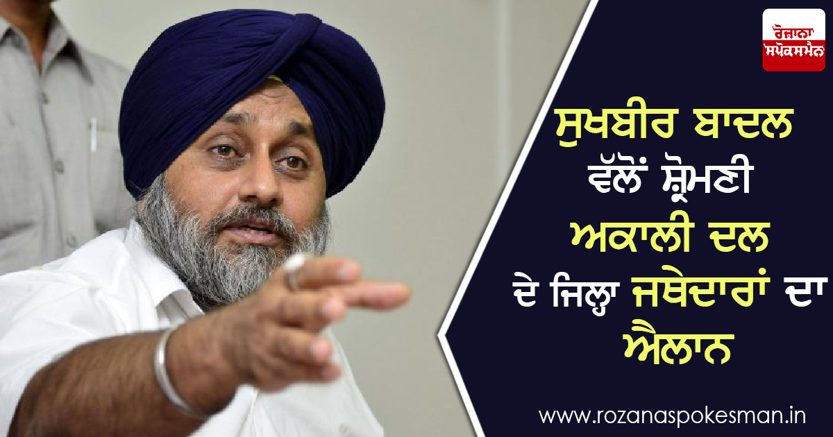 ਅੱਜ ਪਾਰਟੀ ਦੇ ਮੁੱਖ ਦਫਤਰ ਤੋਂ ਇਸ ਸਬੰਧੀ ਜਾਣਕਾਰੀ ਦਿੰਦਿਆਂ ਸੁਖਬੀਰ ਬਾਦਲ ਨੇ ਦੱਸਿਆ ਕਿ ਪਾਰਟੀ ਦੇ ਜਿਨ੍ਹਾਂ ਸੀਨੀਅਰ ਆਗੂਆਂ ਨੂੰ ਜਿਲ੍ਹਾ ਜਥੇਦਾਰ ਬਣਾਇਆ ਗਿਆ ਹੈ।