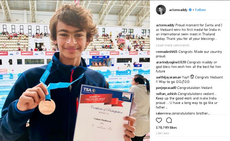 R.Madhwan's son vedant ਦਸ ਦਈਏ ਕਿ ਵੇਦਾਂਤ ਨੇ 'ਥਾਈਲੈਂਡ ਏਜ ਗਰੁੱਪ ਸਵੀਮਿੰਗ ਚੈਪੀਅਨਸ਼ਿੱਪ 2018' 'ਚ 1500 ਮੀਟਰ ਫ੍ਰੀਸਟਾਈਲ 'ਚ ਬ੍ਰੋਂਜ਼ ਮੈਡਲ ਜਿੱਤ ਕੇ ਦੇਸ਼ ਦਾ ਨਾਂ ਰੋਸ਼ਨ ਕੀਤਾ ਹੈ । ਇਕ ਪ੍ਰਾਊਡ ਪਿਤਾ ਵਾਂਗ ਮਾਧਵਨ ਨੇ ਇੰਸਟਾ 'ਤੇ ਖੁਸ਼ੀ ਜ਼ਾਹਿਰ ਕਰਦੇ ਹੋਏ ਕ ਤਸਵੀਰ ਸ਼ੇਅਰ ਕੀਤੀ ਅਤੇ ਲਿਖਿਆ ਕਿ , ''ਇਹ ਮੇਰੀ ਪਤਨੀ ਸਰਿਤਾ ਅਤੇ ਮੇਰੇ ਲਈ ਮਾਣ ਦੀ ਗੱਲ ਹੈ, ਵੇਦਾਂਤ ਨੇ ਥਾਈਲੈਂਡ 'ਚ ਹੋਈ ਇੰਟਰਨੈਸ਼ਨਲ ਸਵਿਮ ਮੀਟ 'ਚ ਭਾਰਤ ਲਈ ਪਹਿਲਾ ਮੈਡਲ ਜਿੱਤਿਆ ਹੈ। ਸਾਰਿਆਂ ਦੇ ਆਸ਼ੀਰਵਾਦ ਲਈ ਸ਼ੁੱਕਰੀਆ।