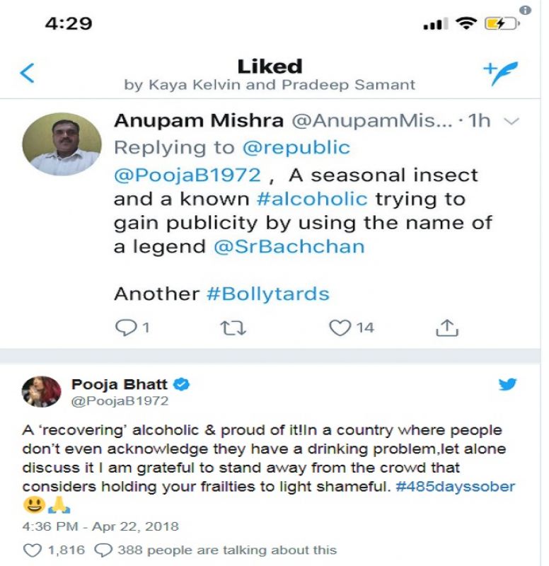 Pooja Bhattਦਰਅਸਲ, ਪੂਜਾ ਦੇ ਇਸ ਟਵੀਟ 'ਤੇ ਲੋਕ ਉਨ੍ਹਾਂ ਨੂੰ ਟਰੋਲ ਕਰਨ ਲੱਗ ਗਏ । ਕੁਝ ਲੋਕਾਂ ਨੇ ਉਨ੍ਹਾਂ ਨੂੰ ਐਲਕੋਹਲਿਕ ਯਾਨੀ ਸ਼ਰਾਬੀ ਤਕ ਕਹਿ ਦਿਤਾ। ਜਿਸ ਤੋਂ ਬਾਅਦ ਪੂਜਾ ਨੇ ਟਰੋਲਰਜ਼ ਦੀ ਜੱਮ ਕੇ ਕਲਾਸ ਲਗਾਈ। ਇਕ ਟਰੋਲਰ ਨੇ ਲਿਖਿਆ ਸੀ, ਇਕ ਸੀਜਨਲ ਕੀੜਾ ਅਤੇ ਇਕ ਜਾਣੀ ਪਛਾਣੀ ਐਲਕੋਹਲਿਕ ਅਮਿਤਾਭ ਬੱਚਨ ਦੇ ਨਾਮ 'ਤੇ ਪਬਲਕਸਿਟੀ ਪਾਉਣ ਦੀ ਕੋਸ਼ਿਸ਼ ਕਰ ਰਹੀ ਹੈ। ਇਸ ਦਾ ਜਵਾਬ ਦਿੰਦੇ ਹੋਏ ਪੂਜਾ ਨੇ ਲਿਖਿਆ, ਸ਼ਰਾਬ ਦੀ ਭੈੜੀ ਆਦਤ ਤੋਂ ਉਭਰਣ ਦੀ ਵਜ੍ਹਾ ਨਾਲ ਮੈਂ ਖੁਦ 'ਤੇ ਮਾਨ ਮਹਿਸੂਸ ਕਰਦੀ ਹਾਂ। ਅਜਿਹੇ ਦੇਸ਼ ਵਿਚ ਜਿੱਥੇ ਲੋਕਾਂ ਨੂੰ ਇਹ ਵੀ ਪਤਾ ਨਹੀਂ ਚੱਲਦਾ ਕਿ ਉਨ੍ਹਾਂ ਨੂੰ ਪੀਣ ਦੀ ਭੈੜੀ ਆਦਤ ਹੈ। ਮੈਨੂੰ ਇਸ ਗੱਲ ਦੀ ਖੁਸ਼ੀ ਹੈ ਕਿ ਮੈਂ ਭੀੜ ਨਾਲੋਂ ਵੱਖਰੀ ਹਾਂ।