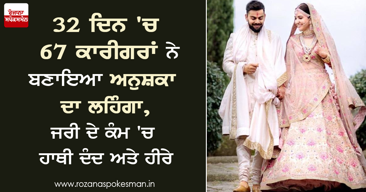 ਵਿਰਾਟ ਕੋਹਲੀ ਅਤੇ ਅਨੁਸ਼ਕਾ ਸ਼ਰਮਾ ਨੇ ਆਪਣਾ ਵਿਆਹ ਪੂਰੀ ਤਰ੍ਹਾਂ ਨਾਲ ਸੀਕਰੇਟ ਰੱਖਿਆ। ਵਿਆਹ ਦੇ ਬਾਅਦ ਸੋਮਵਾਰ ਨੂੰ ਦੋਨਾਂ ਨੇ ਅਨਾਉਂਸਮੈਂਟ ਕੀਤੀ। ਤਸਵੀਰਾਂ ਜਾਰੀ ਕੀਤੀਆਂ। ਵੱਖ - ਵੱਖ ਰਸਮਾਂ ਦੇ ਕਈ ਵੀਡੀਓ ਸਾਹਮਣੇ ਆਏ। ਦੋਨਾਂ ਦੀ ਖੁਸ਼ੀ ਤਸਵੀਰਾਂ ਵਿੱਚ ਸਾਫ਼ ਨਜ਼ਰ ਆ ਰਹੀ ਸੀ। ਚਰਚਾ ਦੋਨਾਂ ਦੇ ਵਿਆਹ ਦੀ ਪੋਸ਼ਾਕ ਅਤੇ ਗਹਿਣਿਆਂ ਦੀ ਵੀ ਹੋ ਰਹੀ ਹੈ। ਬਹੁਤ ਘੱਟ ਲੋਕਾਂ ਨੂੰ ਪਤਾ ਹੈ ਕਿ ਵਿਰਾਟ - ਅਨੁਸ਼ਕਾ ਨੇ ਆਪਣੇ ਵਿਆਹ ਵਿੱਚ ਜੋ ਡਰੈਸ ਪਾਇਆ ਉਸਨੂੰ ਕਈ ਦਿਨਾਂ ਦੀ ਮਿਹਨਤ ਦੇ ਬਾਅਦ ਡਿਜਾਇਨ ਕੀਤਾ ਗਿਆ ਸੀ। ਆਓ ਜਾਣਦੇ ਹਾਂ ਦੋਨਾਂ ਦੇ ਪੋਸ਼ਾਕ ਦੀਆਂ ਖਾਸੀਅਤਾਂ ਦੇ ਬਾਰੇ 'ਚ।