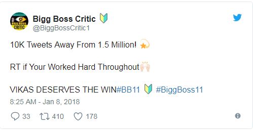 ਬਿਗ ਬਾਸ ਸੀਜਨ 11 ਵਿਚ ਇਕ ਨਹੀਂ ਕਈ ਅਜਿਹੇ ਰਿਕਾਰਡ ਬਣੇ ਹਨ, ਜੋ ਕਿ ਪਹਿਲਾਂ ਕਿਸੇ ਸੀਜਨ ਵਿਚ ਨਹੀਂ ਦੇਖਣ ਨੂੰ ਮਿਲੇ ਸਨ। ਟਵਿਟਰ 'ਤੇ ਵਿਕਾਸ ਗੁਪਤਾ ਦੇ ਸਪੋਰਟ ਵਿਚ ਉਨ੍ਹਾਂ ਦੇ ਫੈਨਸ ਨੇ ਇਕ ਟ੍ਰੈਂਡ ਚਲਾਇਆ। ਇਸ ਟ੍ਰੈਂਡ 'ਤੇ ਹੁਣ ਤੱਕ ਕਰੀਬ 1 . 5 ਮਿਲੀਅਨ ਟਵੀਟ ਹੋ ਚੁੱਕੇ ਹਨ। ਬਿਗ ਬਾਸ ਜਾਂ ਇੰਡੀਅਨ ਟੀਵੀ ਇੰਡਸਟਰੀ ਦੇ ਇਤਿਹਾਸ ਵਿਚ ਇਹ ਪਹਿਲਾ ਮੌਕਾ ਹੈ ਜਦੋਂ ਕਿਸੇ ਕੰਟੇਸਟੈਂਟ ਦੇ ਸਪੋਰਟ ਵਿਚ ਇਨ੍ਹੇ ਜ਼ਿਆਦਾ ਟਵੀਟ ਹੋਏ ਹੋਣ।