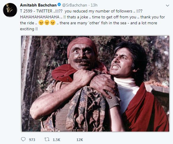 ਅਮਿਤਾਭ ਨੇ ਟਵੀਟ ਕਰਕੇ ਦੋਸ਼ ਲਗਾਇਆ ਕਿ ਟਵਿਟਰ ਨੇ ਉਨ੍ਹਾਂ ਦੇ ਫਾਲੋਅਰਜ਼ ਘਟਾ ਦਿੱਤੇ ਹਨ। ਟਵੀਟ 'ਚ ਉਨ੍ਹਾਂ ਨੇ ਲਿਖਿਆ ਹੈ ਟਵਿਟਰ ? ਤੁਸੀਂ ਮੇਰੇ ਫਾਲੋਅਰਜ਼ ਦੀ ਗਿਣਤੀ ਘੱਟ ਕਰ ਦਿੱਤੀ ? ਹਾਹਾਹਾਹਾ..ਇਹ ਮਜ਼ਾਕ ਹੈ। ਸਮਾਂ ਆ ਗਿਆ ਹੈ ਕਿ ਮੈਂ ਤੁਹਾਡੇ ਤੋਂ ਅਲਵਿਦਾ ਲੈ ਲਵਾਂ। ਇਸ ਯਾਤਰਾ ਲਈ ਧੰਨਵਾਦ। ਸਮੁੰਦਰ 'ਚ ਹੋਰ ਵੀ ਮੱਛਲੀਆਂ ਹਨ, ਜੋ ਤੁਹਾਡੇ ਨਾਲੋਂ ਵੀ ਜ਼ਿਆਦਾ ਦਿਲਚਸਪ ਹਨ। ਤੁਹਾਨੂੰ ਦੱਸ ਦੇਈਏ ਕਿ ਅਮਿਤਾਭ ਦੀ ਟਵਿਟਰ 'ਤੇ ਫਾਲੋਅਰਸ ਦੀ ਗਿਣਤੀ 32897991 ਮਿਲੀਅਨ ਹੈ ਜਦੋਂ ਕਿ ਕੁਝ ਦਿਨ ਪਹਿਲਾਂ ਹੀ ਮਹਾਨਾਇਕ ਨੂੰ ਮਾਤ ਦਿੰਦੇ ਹੋਏ ਖਾਨ ਦੇ ਫਾਲੋਅਰਜ਼ ਦੀ ਗਿਣਤੀ ਵੱਧ ਕੇ 32933940 ਹੋ ਗਈ ਹੈ।