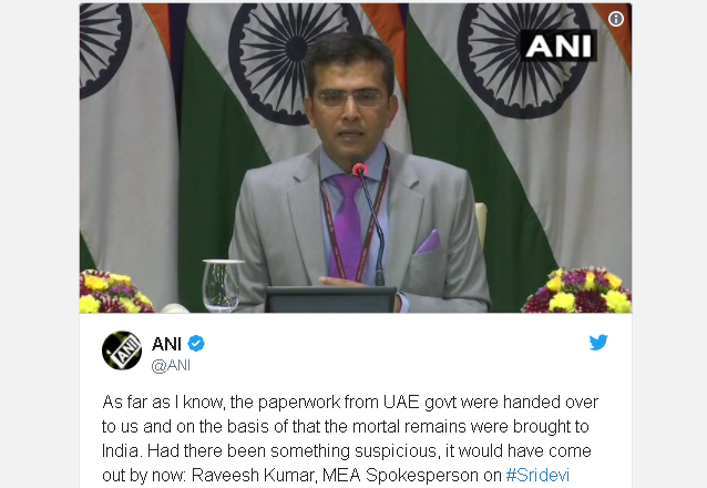 24 ਫਰਵਰੀ ਨੂੰ ਦੁਬਈ 'ਚ ਹੋਈ ਬਾਲੀਵੁੱਡ ਅਦਾਕਾਰਾ ਸ਼੍ਰੀਦੇਵੀ ਦੀ ਮੌਤ ਤੋਂ ਬਾਅਦ ਭਾਰਤ ਦੇ ਵਿਦੇਸ਼ ਮੰਤਰਾਲੇ ਨੇ ਪਹਿਲੀ ਵਾਰ ਆਪਣੀ ਚੁੱਪੀ ਤੋੜੀ ਅਤੇ ਕਿਹਾ ਕਿ ਅਦਾਕਾਰਾ ਦੀ ਮੌਤ ਤੇ ਅਜਿਹਾ ਕੁਝ ਵੀ ਨਹੀਂ ਸੀ ਜੋ ਸ਼ੱਕ ਕਰਨਯੋਗ ਹੋਵੇ। ਇਹ ਜਾਣਕਾਰੀ ਵਿਦੇਸ਼ ਮੰਤਰਾਲੇ ਦੇ ਬੁਲਾਰੇ ਰਵੀਸ਼ ਕੁਮਾਰ ਨੇ ਦਿਤੀ। ਉਹਨਾਂ ਕਿਹਾ ਕਿ ਜਿੱਥੇ ਤੱਕ ਮੈਨੂੰ ਪਤਾ ਹੈ, ਯੂ.ਪੀ.ਏ. ਸਰਕਾਰ ਤੋਂ ਦਸਤਾਵੇਜ਼ ਸਾਨੂੰ ਮਿਲ ਚੁਕੇ ਹਨ, ਅਤੇ ਇਸ ਵਿਚ ਕੁਝ ਵੀ ਸ਼ੱਕੀ ਹੁੰਦਾ ਤਾਂ ਹੁਣ ਤਕ ਸਾਹਮਣੇ ਆ ਗਿਆ ਹੁੰਦਾ।