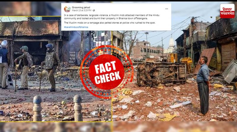 ਫੇਸਬੁੱਕ ਪੇਜ਼ Grooming jehad ਨੇ 13 ਮਾਰਚ ਨੂੰ ਵਾਇਰਲ ਤਸਵੀਰਾਂ ਸੇਅਰ ਕੀਤੀਆਂ ਅਤੇ ਕੈਪਸ਼ਨ ਲਿਖਿਆ,''In a case of deliberate, largscale violence, a Muslim mob attacked members of the Hindu community and looted and burnt their property in Bhainsa town ofTelangana. The Muslim mobs on a rampage also pelted stones at police who rushed to the spot.