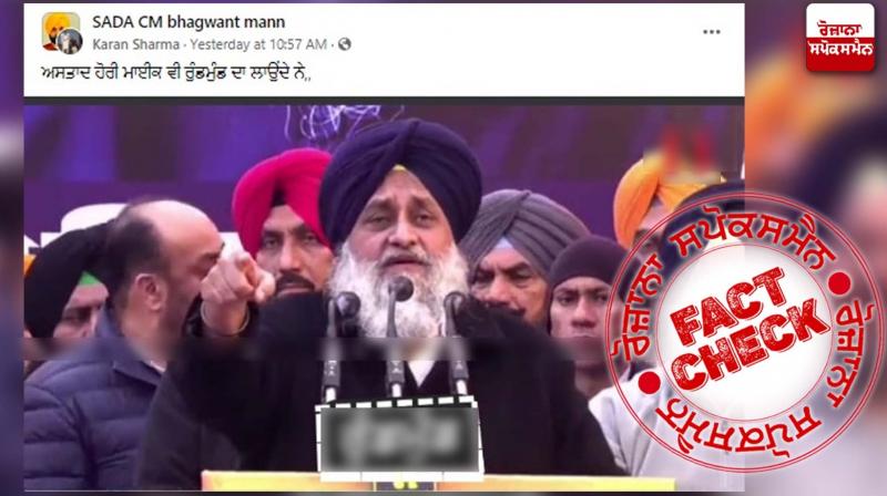 RSFC (Team Mohali)- ਸੋਸ਼ਲ ਮੀਡੀਆ 'ਤੇ ਸ਼੍ਰੋਮਣੀ ਅਕਾਲੀ ਦਲ ਦੇ ਪ੍ਰਧਾਨ ਸੁਖਬੀਰ ਸਿੰਘ ਬਾਦਲ ਦੇ ਭਾਸ਼ਣ ਦਾ ਇੱਕ ਸਕ੍ਰੀਨਸ਼ੋਟ ਵਾਇਰਲ ਹੋ ਰਿਹਾ ਹੈ ਜਿਸਦੇ ਵਿਚ ਉਨ੍ਹਾਂ ਦੇ ਮਾਇਕ ਹੇਠਾਂ ਮੰਦੀ ਸ਼ਬਦਾਵਲੀ ਲਿਖੀ ਵੇਖੀ ਜਾ ਸਕਦੀ ਹੈ। ਇਸ ਸਕ੍ਰੀਨਸ਼ੋਟ ਨੂੰ ਵਾਇਰਲ ਕਰਦਿਆਂ ਉਨ੍ਹਾਂ 'ਤੇ ਤਨਜ ਕੱਸਿਆ ਜਾ ਰਿਹਾ ਹੈ।