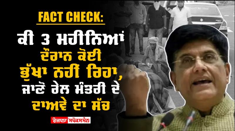 ਦਾਅਵਾ: ਕੇਂਦਰੀ ਰੇਲਵੇ ਮੰਤਰੀ ਪੀਯੂਸ਼ ਗੋਇਲ ਨੇ ਇਹ ਦਾਅਵਾ ਕੀਤਾ ਕਿ ਦੇਸ਼ ਵਿਚ ਕੋਰੋਨਾ ਵਾਇਰਸ ਦੀ ਮਹਾਂਮਾਰੀ ਦੌਰਾਨ ਕੋਈ ਭੁੱਖ ਨਹੀਂ ਰਿਹਾ।