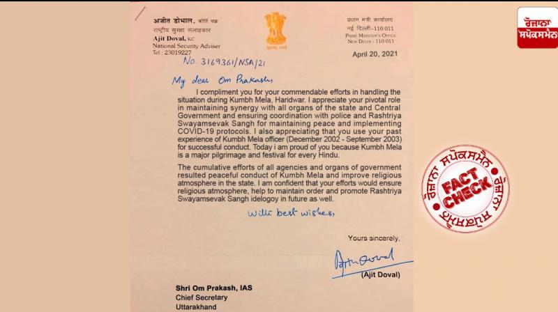 ਰੋਜ਼ਾਨਾ ਸਪੋਕਸਮੈਨ (ਮੋਹਾਲੀ ਟੀਮ) - ਸੋਸ਼ਲ ਮੀਡੀਆ 'ਤੇ ਰਾਸ਼ਟਰੀ ਸੁਰੱਖਿਆ ਸਲਾਹਕਾਰ ਅਜੀਤ ਡੋਭਾਲ ਦੇ ਨਾਂ ਤੋਂ ਇੱਕ ਪੱਤਰ ਵਾਇਰਲ ਹੋ ਰਿਹਾ ਹੈ ਜਿਸ ਦੇ ਵਿਚ ਉਹ ਉੱਤਰਾਖੰਡ ਦੇ ਮੁਖ ਸਕੱਤਰ ਨੂੰ ਪੁਲਿਸ ਅਤੇ RSS ਦੇ ਵਰਕਰਾਂ ਵੱਲੋਂ ਕੁੰਭ ਮੇਲੇ ਦੀ ਕਾਮਯਾਬੀ ਨੂੰ ਲੈ ਕੇ ਧੰਨਵਾਦ ਕਰ ਰਹੇ ਹਨ। ਉਨ੍ਹਾਂ ਨੇ ਇਸ ਪੱਤਰ ਵਿਚ ਇਹ ਵੀ ਲਿਖਿਆ ਹੈ ਕਿ ਭਵਿੱਖ ਵਿਚ ਵੀ ਉਹ RSS ਦੀ ਵਿਚਾਰਧਾਰਾ ਦਾ ਪ੍ਰਚਾਰ ਕਰਦੇ ਰਹਿਣਗੇ।