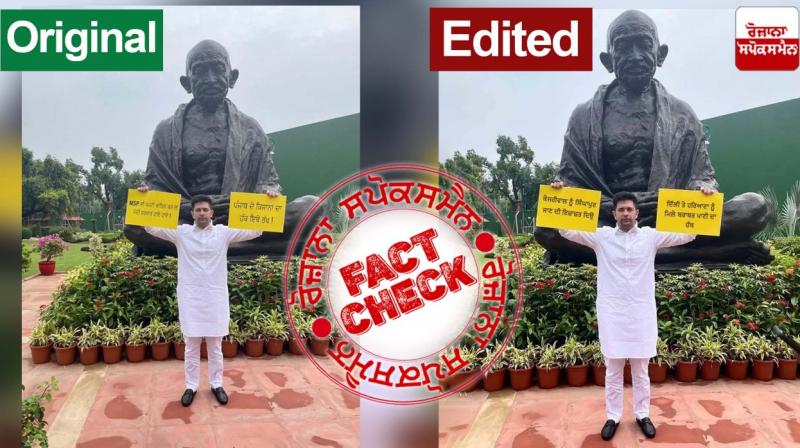 RSFC (Team Mohali)- ਸੋਸ਼ਲ ਮੀਡੀਆ 'ਤੇ ਆਮ ਆਦਮੀ ਪਾਰਟੀ ਤੋਂ MP ਰਾਘਵ ਚੱਢਾ ਦੀ ਇੱਕ ਤਸਵੀਰ ਵਾਇਰਲ ਹੋ ਰਹੀ ਹੈ ਜਿਸਦੇ ਵਿਚ ਉਹ ਮਹਾਤਮਾ ਗਾਂਧੀ ਦੇ ਬੁੱਤ ਦੇ ਸਾਹਮਣੇ 2 ਬੋਰਡ ਫੜ੍ਹੇ ਵੇਖੇ ਜਾ ਸਕਦੇ ਹਨ। ਇੱਕ 'ਤੇ ਲਿਖਿਆ ਹੈ ਕਿ ਅਰਵਿੰਦ ਕੇਜਰੀਵਾਲ ਨੂੰ ਸਿੰਗਾਪੁਰ ਜਾਣ ਦੀ ਇਜਾਜ਼ਤ ਦਿੱਤੀ ਜਾਵੇ ਅਤੇ ਦੂਜੇ 'ਤੇ ਲਿਖਿਆ ਹੈ ਕਿ ਦਿੱਲੀ ਅਤੇ ਹਰਿਆਣਾ ਨੂੰ ਪਾਣੀ ਦਾ ਬਰਾਬਰ ਹੱਕ ਦਿੱਤਾ ਜਾਵੇ। ਹੁਣ ਇਸ ਤਸਵੀਰ ਨੂੰ ਵਾਇਰਲ ਕਰਦਿਆਂ ਦਾਅਵਾ ਕੀਤਾ ਜਾ ਰਿਹਾ ਹੈ ਕਿ ਪੰਜਾਬ ਤੋਂ ਰਾਜ ਸਭਾ ਮੇਂਬਰ ਰਾਘਵ ਚੱਢਾ ਪੰਜਾਬ ਦੇ ਹਿਤਾਂ ਖਿਲਾਫ ਗੱਲ ਕਰ ਰਹੇ ਹਨ।