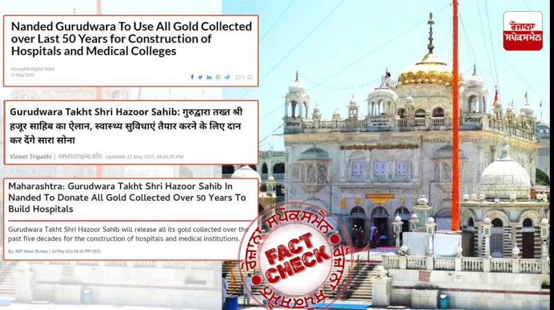 ਰੋਜ਼ਾਨਾ ਸਪੋਕਸਮੈਨ (ਮੋਹਾਲੀ ਟੀਮ) - ਦੇਸ਼ ਵਿਚ ਕੋਰੋਨਾ ਮਹਾਂਮਾਰੀ ਦੀ ਦੂਜੀ ਲਹਿਰ ਆਪਣਾ ਪ੍ਰਕੋਪ ਦਿਖਾ ਰਹੀ ਹੈ ਅਤੇ ਇਸ ਲਹਿਰ ਵਿਚ ਸੇਵਾ ਦੀ ਮਿਸਾਲ ਕਈ ਸੰਸਥਾਵਾਂ ਵੱਲੋਂ ਪੇਸ਼ ਕੀਤੀ ਗਈ। ਹੁਣ ਗੁਰੂਦੁਆਰਾ ਸ਼੍ਰੀ ਸੱਚਖੰਡ ਨਾਂਦੇੜ ਸਾਹਿਬ ਦੀ ਸੇਵਾ ਦੇ ਨਾਂਅ ਤੋਂ ਇੱਕ ਦਾਅਵਾ ਵਾਇਰਲ ਹੋ ਰਿਹਾ ਹੈ। ਦਾਅਵੇ ਅਨੁਸਾਰ ਨਾਂਦੇੜ ਸਾਹਿਬ ਵੱਲੋਂ ਪਿਛਲੇ 5 ਸਾਲਾਂ ਵਿਚ ਇਕੱਠਾ ਹੋਇਆ ਸੋਨਾ ਸੰਗਤਾਂ ਦੀ ਸੇਵਾ ਲਈ ਦਾਨ ਕਰਨ ਦਾ ਐਲਾਨ ਕੀਤਾ ਗਿਆ ਹੈ। ਇਹ ਸਾਰਾ ਸੋਨਾ ਵੇਚ ਕੇ ਸੰਗਤਾਂ ਲਈ ਹਸਪਤਾਲ ਅਤੇ ਜ਼ਰੂਰੀ ਸੇਵਾਵਾਂ ਲਈ ਕੰਮ ਕੀਤਾ ਜਾਵੇਗਾ।