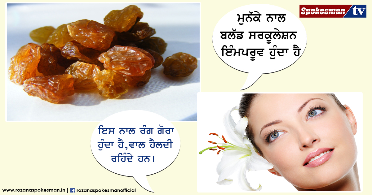 4 .ਮੁਨੱਕੇ ਨਾਲ ਬਲੱਡ ਸਰਕੂਲੇਸ਼ਨ ਇੰਮਪਰੂਵ ਹੁੰਦਾ ਹੈ, ਇਸ ਨਾਲ ਰੰਗ ਗੋਰਾ ਹੁੰਦਾ ਹੈ, ਵਾਲ ਹੈਲਦੀ ਰਹਿੰਦੇ ਹਨ।