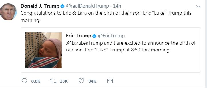 ਅਮਰੀਕਾ ਦੇ 45ਵੇਂ ਰਾਸ਼ਟਰਪਤੀ ਡੋਨਾਲਡ ਟਰੰਪ 9ਵੀਂ ਵਾਰੀ ਦਾਦਾ ਬਣੇ ਹਨ। ਰਾਸ਼ਟਰਪਤੀ ਡੋਨਾਲਡ ਸੰਗਠਨ ਨੇ ਟਵੀਟ ਕਰ ਕੇ ਘਰ ਆਏ ਨਵੇਂ ਮਹਿਮਾਨ ਬਾਰੇ ਦੱਸਿਆ। ਟਰੰਪ ਨੇ ਟਵੀਟ ਕਰ ਆਪਣੇ ਬੇਟੇ ਏਰਿਕ ਅਤੇ ਨੂੰਹ ਲਾਰਾ ਨੂੰ ਵਧਾਈ ਦਿੱਤੀ। ਏਰਿਕ, ਡੋਨਾਲਡ ਟਰੰਪ ਅਤੇ ਇਵਾਨਾ ਟਰੰਪ ਦੇ ਬੇਟੇ ਹਨ।