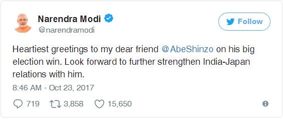 ਮੋਦੀ ਨੇ ਟਵੀਟ ਕੀਤਾ ਹੈ, ''ਮੇਰੇ ਪਿਆਰੇ ਮਿੱਤਰ @ ਆਬੇਸ਼ਿੰਜੋ ਨੂੰ ਚੋਣ ਵਿਚ ਬੇਮਿਸਾਲ ਜਿੱਤ ਲਈ ਹਾਰਦਿਕ ਵਧਾਈ। ਮੈਂ ਉਨ੍ਹਾਂ ਦੇ ਨਾਲ ਮਿਲ ਕੇ ਭਾਰਤ-ਜਾਪਾਨ ਸਬੰਧਾਂ ਨੂੰ ਹੋਰ ਮਜ਼ਬੂਤ ਬਣਾਉਣ ਨੂੰ ਉਤਸੁਕ ਹਾਂ।'' ਮੋਦੀ ਅਤੇ ਆਬੇ ਦੇ ਵਿਚ ਸੰਬੰਧ ਬਹੁਤ ਚੰਗੇ ਹਨ ਅਤੇ ਪਿਛਲੇ ਤਿੰਨ ਸਾਲਾਂ ਵਿਚ ਦੋਵਾਂ ਨੇਤਾਵਾਂ ਦੀ ਕਈ ਵਾਰ ਭੇਂਟ ਹੋਈ ਹੈ। ਗੁਜਰਾਤ ਵਿਚ ਹਾਲ ਹੀ ਵਿਚ ਆਯੋਜਿਤ ਇੱਕ ਸਾਲਾਨਾ ਸੰਮੇਲਨ ਵਿਚ ਆਬੇ ਨੇ ਮੋਦੀ ਨਾਲ ਭਾਗ ਲਿਆ ਸੀ।