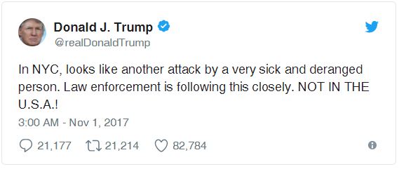 ਟਰੰਪ ਨੇ ਟਵੀਟ ਕੀਤਾ, ਮੀਡਿਲ ਈਸਟ ਵਿੱਚ ਹਰਾਉਣ ਦੇ ਬਾਅਦ ਹੁਣ ISIS ਨੂੰ ਵਾਪਸ ਨਹੀਂ ਆਉਣ ਦੇਵਾਂਗੇ ਅਤੇ ਨਾ ਹੀ ਅਮਰੀਕਾ ਅੰਦਰ ਦਾਖਲ ਹੋਣ ਦੇਵਾਂਗੇ। ਰਾਸ਼ਟਰਪਤੀ ਟਰੰਪ ਹਮਲੇ ਵਿੱਚ ਮਾਰੇ ਗਏ ਲੋਕਾਂ ਦੇ ਪ੍ਰਤੀ ਆਪਣੀ ਸਨਸਨੀ ਵੀ ਜਾਹਿਰ ਕੀਤੀ ਹੈ।
