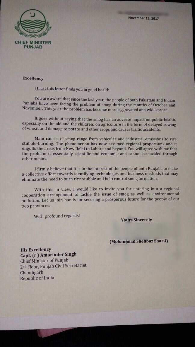 ਜਲੰਧਰ: ਪਾਕਿਸਤਾਨ ਦੇ ਪੰਜਾਬ ਪ੍ਰਾਂਤ ਦੇ ਮੁੱਖਮੰਤਰੀ ਸ਼ਹਬਾਜ ਸ਼ਰੀਫ ਨੇ ਕੈਪਟਨ ਅਮਰਿੰਦਰ ਸਿੰਘ ਨੂੰ ਪੱਤਰ ਲਿਖ ਸਮੋਗ ਅਤੇ ਪ੍ਰਦੂਸ਼ਣ ਦੀ ਸਮੱਸਿਆ ਤੋਂ ਨਿੱਬੜਨ ਲਈ ਖੇਤਰੀ ਸਹਿਯੋਗ ਵਿਵਸਥਾ ਬਣਾਉਣ ਦਾ ਸੁਝਾਅ ਦਿੱਤਾ ਹੈ।