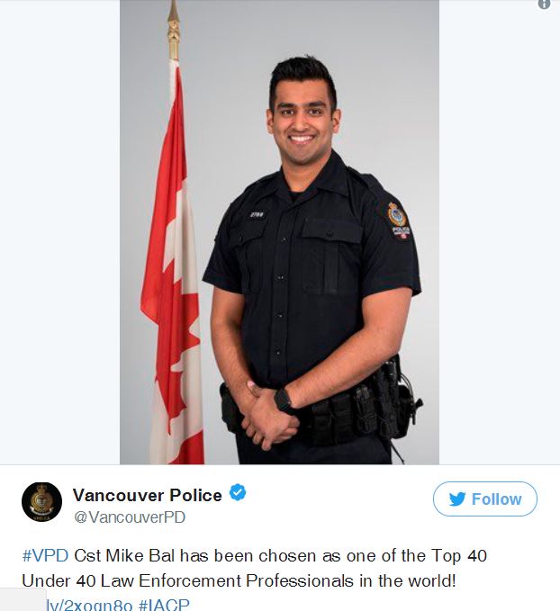 ਨਿਊਯਾਰਕ: 40 ਸਾਲ ਤੋਂ ਘੱਟ ਉਮਰ ਦੇ 40 ਵਧੀਆ ਮੰਨੇ ਗਏ ਪੁਲਿਸ ਅਧਿਕਾਰੀਆਂ 'ਚ ਵੈਨਕੂਵਰ ਕੈਨੇਡਾ ਪੁਲਿਸ ਵਿਚ ਪੰਜਾਬੀ ਮੂਲ ਦੇ ਮਾਈਕਲ ਬੱਲ ਦਾ ਨਾਂ ਵੀ ਸ਼ਾਮਿਲ ਹੈ, ਜਿਸਦੀ ਉਮਰ 29 ਸਾਲ ਹੈ। ਉਸ ਦੇ ਕੰਮ ਅਤੇ ਲਗਨ ਦੀ ਕਾਫ਼ੀ ਸ਼ਲਾਘਾ ਹੋਣ ਕਾਰਨ ਉਸ ਦੀ ਕਾਰਗੁਜ਼ਾਰੀ ਨੂੰ ਲੈ ਕੇ ਇੰਨਾ ਵੱਡਾ ਸਨਮਾਨ ਪੁਲਿਸ ਮੁੱਖੀਆ ਦੀ ਅੰਤਰਰਾਸ਼ਟਰੀ ਐਸੌਸੀਏਸ਼ਨ ਵੱਲੋਂ ਦਿੱਤਾ ਗਿਆ ਹੈ।