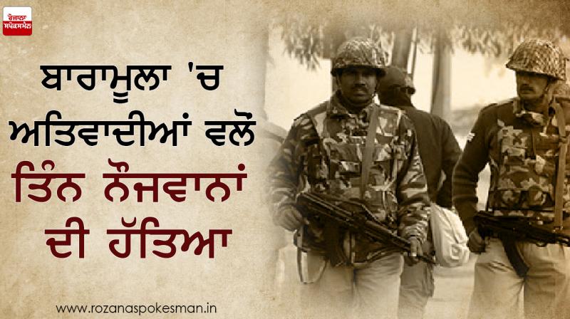 ਸ੍ਰੀਨਗਰ : ਜੰਮੂ-ਕਸ਼ਮੀਰ ਦੇ ਬਾਰਾਮੂਲਾ ਜ਼ਿਲ੍ਹੇ ਦੇ ਪੁਰਾਣੇ ਟਾਊਨ ਇਲਾਕੇ ਵਿਚ ਲਸ਼ਕਰ ਏ ਤੋਇਬਾ ਦੇ ਅਤਿਵਾਦੀਆਂ ਨੇ ਦੇਰ ਰਾਤ ਤਿੰਨ ਨੌਜਵਾਨਾਂ ਦੀ ਗੋਲੀ ਮਾਰ ਕੇ ਹੱਤਿਆ ਕਰ ਦਿਤੀ। ਪੁਲਿਸ ਦੇ ਇਕ ਬੁਲਾਰੇ ਨੇ ਦਸਿਆ ਕਿ ਅਤਿਵਾਦੀਆਂ ਨੇ ਪੁਰਾਣੇ ਟਾਊਨ ਦੀ ਇਕਬਾਲ ਮਾਰਕੀਟ ਇਲਾਕੇ ਵਿਚ ਉਨ੍ਹਾਂ ਨੂੰ ਨੇੜਿਉਂ ਗੋਲੀਆਂ ਮਾਰੀਆਂ, ਜਿਸ ਨਾਲ ਉਨ੍ਹਾਂ ਦੀ ਮੌਕੇ 'ਤੇ ਹੀ ਮੌਤ ਹੋ ਗਈ।