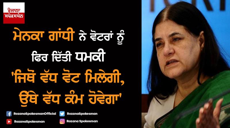 ਸੁਲਤਾਨਪੁਰ : ਕੇਂਦਰੀ ਮੰਤਰੀ ਅਤੇ ਭਾਜਪਾ ਉਮੀਦਵਾਰ ਮੇਨਕਾ ਗਾਂਧੀ ਨੇ ਇਕ ਵਾਰ ਫਿਰ ਵੋਟਰਾਂ ਨੂੰ ਧਮਕੀ ਦਿੱਤੀ ਹੈ। ਉਨ੍ਹਾਂ ਨੇ ਸਾਫ਼ ਸ਼ਬਦਾਂ 'ਚ ਕਿਹਾ ਕਿ ਜਿੱਥੋਂ ਜਿੰਨੀ ਵੋਟ ਮਿਲੇਗੀ, ਉੱਥੇ ਓਨਾ ਕੰਮ ਹੋਵੇਗਾ। ਐਤਵਾਰ ਨੂੰ ਉਹ ਇਸੌਲੀ ਵਿਧਾਨ ਸਭਾ ਖੇਤਰ ਦੇ ਰਸੂਲਪੁਰ 'ਚ ਬੂਥ ਵਰਕਰਾਂ ਨੂੰ ਸੰਬੋਧਤ ਕਰ ਰਹੇ ਸਨ।ਮੇਨਕਾ ਨੇ ਵਰਕਰਾਂ ਅਤੇ ਲੋਕਾਂ ਨੂੰ ਵੱਡੀ ਜਿੱਤ ਦਿਵਾਉਣ ਦੀ ਅਪੀਲ ਕੀਤੀ ਅਤੇ ਕਿਹਾ ਕਿ ਵਰਕਰਾਂ ਦੇ ਮਾਣ-ਸਨਮਾਨ ਦੀ ਰੱਖਿਆ ਕਰਨੀ ਸਾਨੂੰ ਆਉਂਦੀ ਹੈ। ਇਸੇ ਕਾਰਨ ਪੀਲੀਭੀਤ ਨੇ 7 ਵਾਰ ਸਾਡੇ 'ਤੇ ਭਰੋਸਾ ਜਤਾਇਆ ਹੈ।