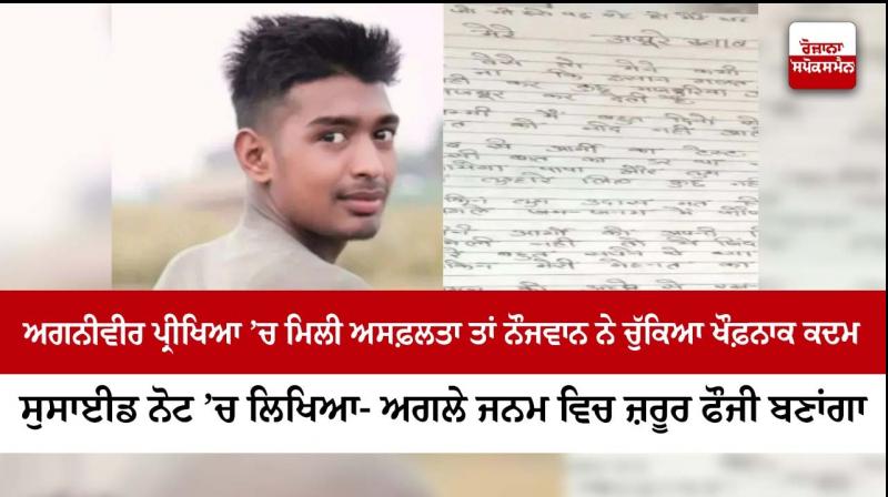 ਨਵੀਂ ਦਿੱਲੀ: ਦੇਸ਼ ਦੀ ਸੇਵਾ ਕਰਨ ਦਾ ਸੁਪਨਾ ਦੇਖਣ ਵਾਲੇ ਨੌਜਵਾਨ ਨੇ ਅਗਨੀਵੀਰ ਪ੍ਰੀਖਿਆ ਵਿਚ ਅਸਫਲ ਹੋਣ ਮਗਰੋਂ ਖੁਦਕੁਸ਼ੀ ਕਰ ਲਈ। ਇਹ ਖ਼ੌਫਨਾਕ ਕਦਮ ਚੁੱਕਣ ਤੋਂ ਪਹਿਲਾਂ ਉਸ ਨੇ ਲਿਖਿਆ ਕਿ ਉਹ ਅਗਲੇ ਜਨਮ ਵਿਚ ਫੌਜੀ ਜ਼ਰੂਰ ਬਣੇਗਾ। ਮਾਮਲਾ ਉੱਤਰ ਪ੍ਰਦੇਸ਼ ਦੇ ਅਲੀਗੜ੍ਹ ਦਾ ਹੈ। 22 ਸਾਲਾ ਦੀਪੂ ਸਿੰਘ ਫੌਜ 'ਚ ਭਰਤੀ ਹੋਣ ਲਈ 'ਅਗਨੀਵੀਰ' ਪ੍ਰੀਖਿਆ ਪਾਸ ਨਹੀਂ ਕਰ ਸਕਿਆ। ਉਸ ਨੂੰ ਇੰਨਾ ਸਦਮਾ ਲੱਗਿਆ ਕਿ ਉਸ ਨੇ ਆਪਣੀ ਜਾਨ ਲੈ ਲਈ।