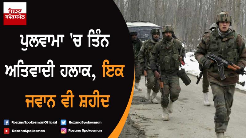 ਸ੍ਰੀਨਗਰ : ਜੰਮੂ ਕਸ਼ਮੀਰ ਦੇ ਪੁਲਵਾਮਾ ਜ਼ਿਲੇ 'ਚ ਹੋਏ ਮੁਕਾਰਬਲੇ ਵਿਚ ਤਿੰਨ ਅਤਿਵਾਦੀ ਮਾਰੇ ਗਏ ਅਤੇ ਇਕ ਨਾਗਰਿਕ ਦੀ ਮੌਦ ਹੋ ਗਈ ਜਦਕਿ ਇਸ ਦੌਰਾਨ ਇਕ ਜਵਾਨ ਵੀ ਸ਼ਹੀਦ ਹੋ ਗਿਆ। ਪੁਲਿਸ ਦੇ ਇਕ ਅਧਿਕਾਰੀ ਨੇ ਦਸਿਆ ਕਿ ਅੱਤਵਾਦੀਆਂ ਦੀ ਮੌਜੂਦਗੀ ਬਾਰੇ ਖ਼ੂਫ਼ੀਆ ਜਾਣਕਾਰੀ ਦੇ ਆਧਾਰ 'ਤੇ ਰਾਸ਼ਟਰੀ ਰਾਈਫ਼ਲ , ਕੇਂਦਰੀ ਰਿਜ਼ਰਵ ਪੁਲਿਸ ਅਤੇ ਜੰਮੂ-ਕਸ਼ਮੀਰ ਪਿਲਸ ਦੇ ਵਿਸ਼ੇਸ਼ ਦਲ ਨੇ ਅੱਜ ਤੜਕੇ ਪੁਲਵਾਮਾ ਦੇ ਡੇਲੀਪੁਰਾ ਪਿੰਡ 'ਚ ਮੁਹਿੰਮ ਸ਼ੁਰੂ ਕੀਤੀ।