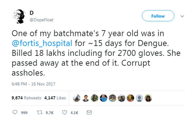 - ਉਨ੍ਹਾਂ ਨੇ ਇਸ ਵਿੱਚ ਲਿਖਿਆ, ਮੇਰੇ ਸਾਥੀ ਦੀ 7 ਸਾਲ ਦੀ ਧੀ ਡੇਂਗੂ ਦੇ ਇਲਾਜ ਲਈ 15 ਦਿਨ ਤੱਕ ਫੋਰਟਿਸ ਹਸਪਤਾਲ ਵਿੱਚ ਭਰਤੀ ਰਹੀ। ਹਸਪਤਾਲ ਨੇ ਇਸਦੇ ਲਈ ਉਨ੍ਹਾਂ ਨੂੰ 16 ਲੱਖ ਦਾ ਬਿਲ ਦਿੱਤਾ। ਇਸ ਵਿੱਚ 2700 ਦਸਤਾਨੇ ਅਤੇ 660 ਸਿਰਿੰਜ ਵੀ ਸ਼ਾਮਿਲ ਸਨ। ਅਖੀਰ ਵਿੱਚ ਬੱਚੀ ਦੀ ਮੌਤ ਹੋ ਗਈ।